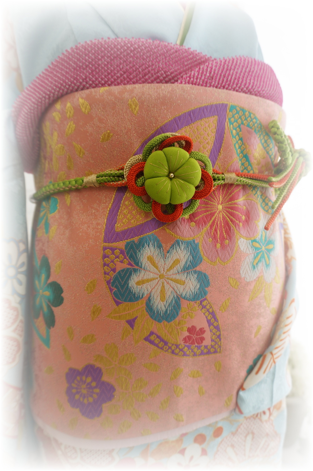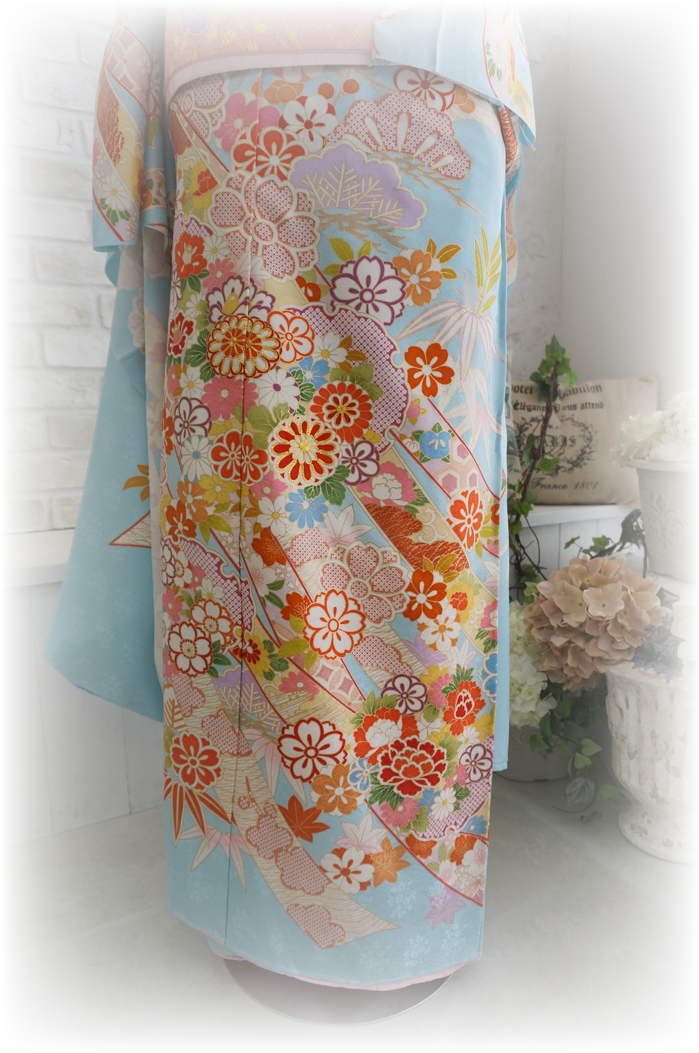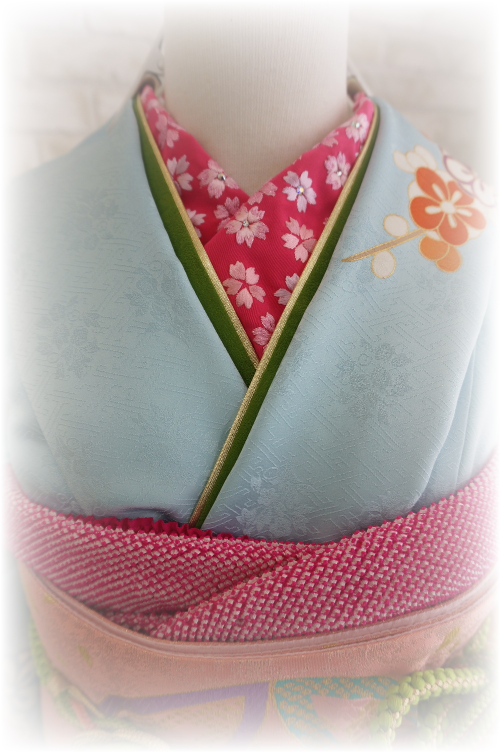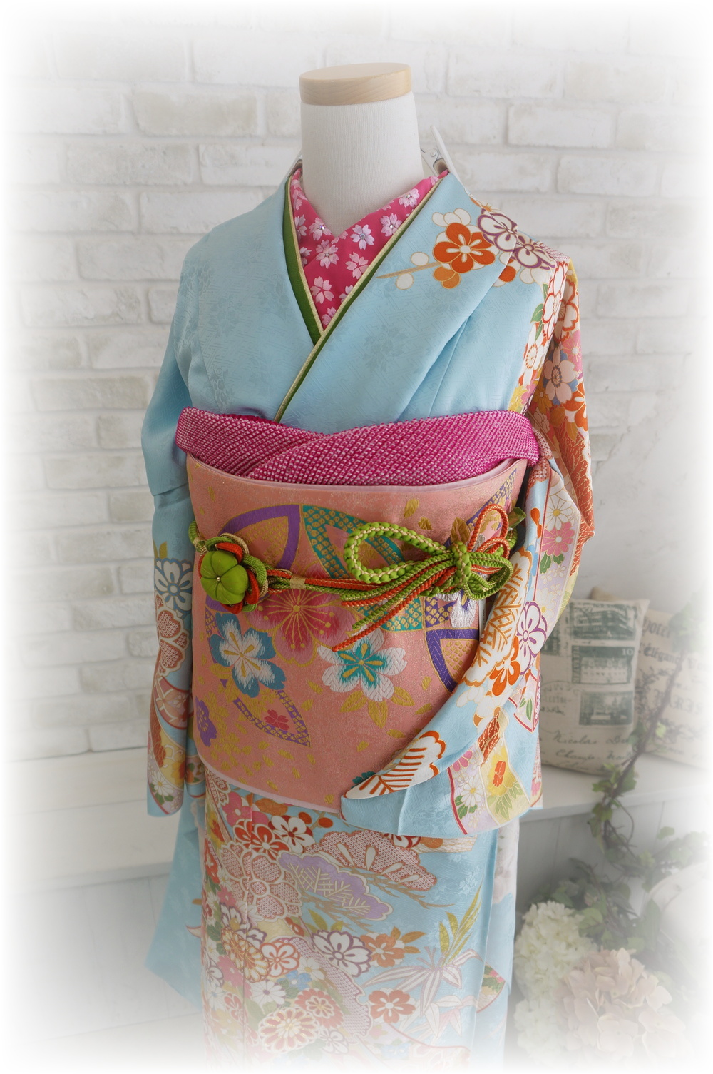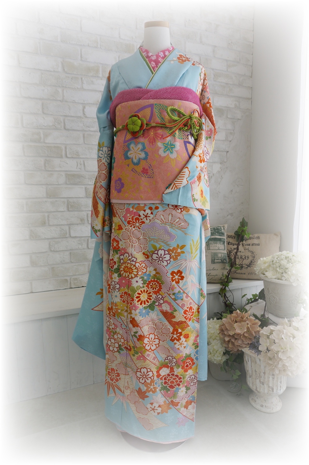 淡い水色のお振袖に、濃いピンク色の半襟や帯揚げをアクセントにしてみました。