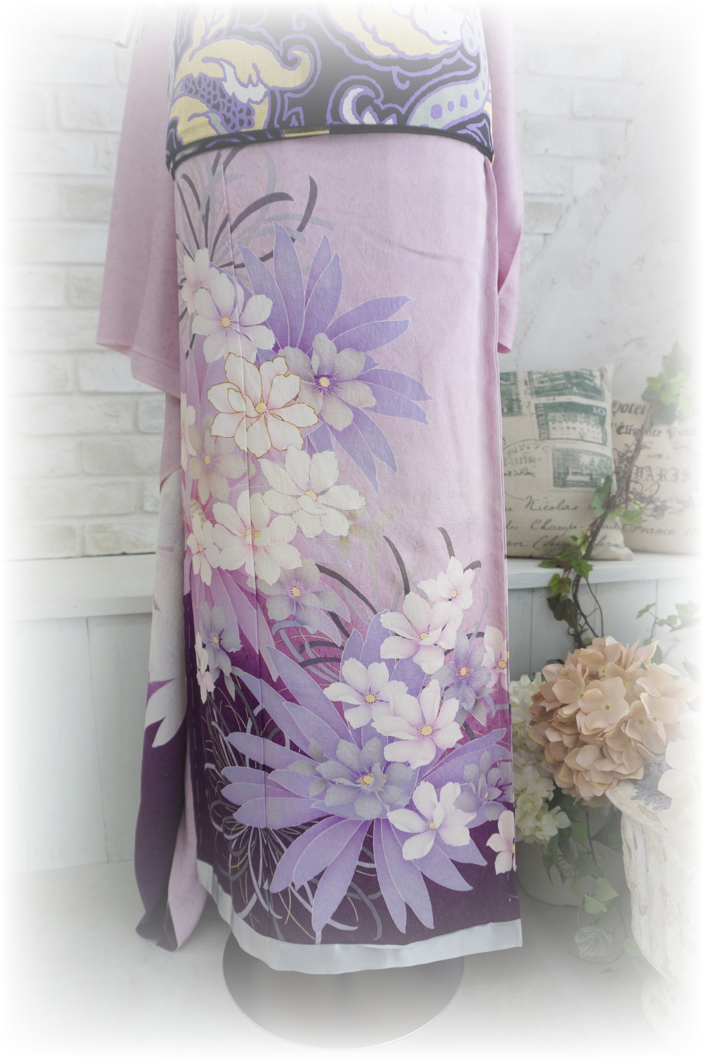 今回は、紫色のお振袖や重ね衿、袋帯を使用して、同系色コーディネートにしてみました。