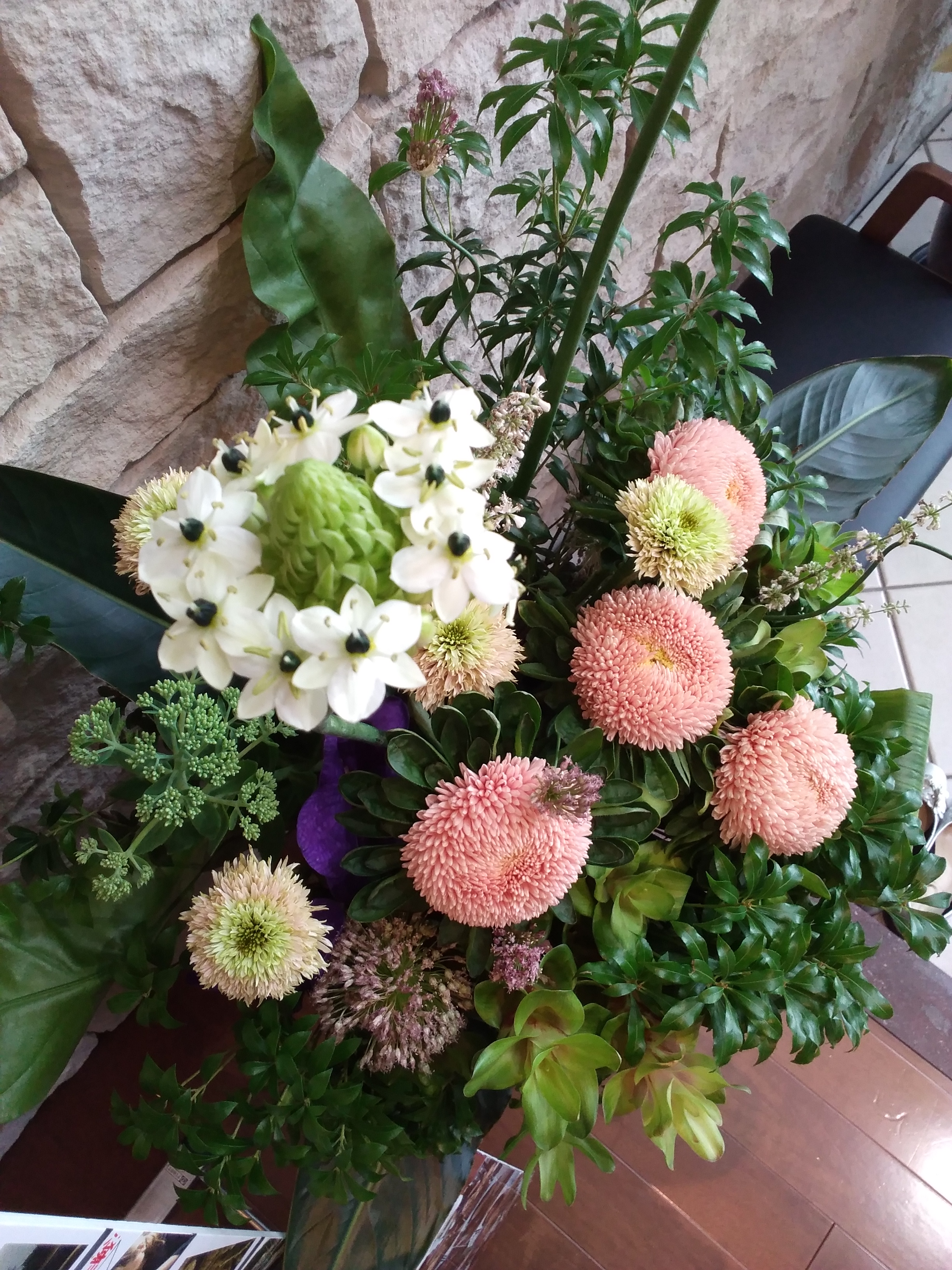 ピンクの可愛らしい菊と、ピンボケしてしまいましたが背の高い謎の白いお花…。