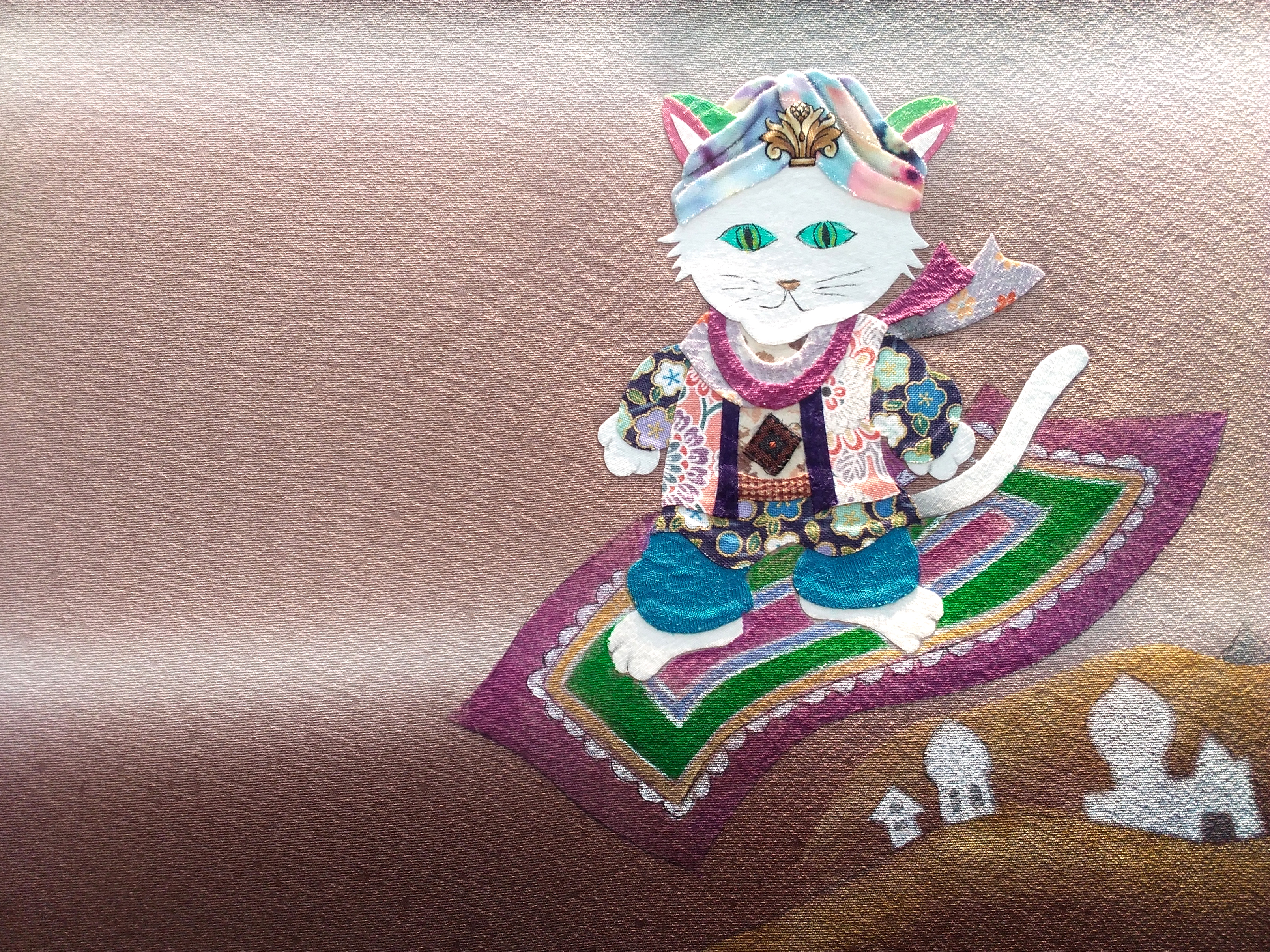 切った布を貼り重ねて絵を描いているのです!