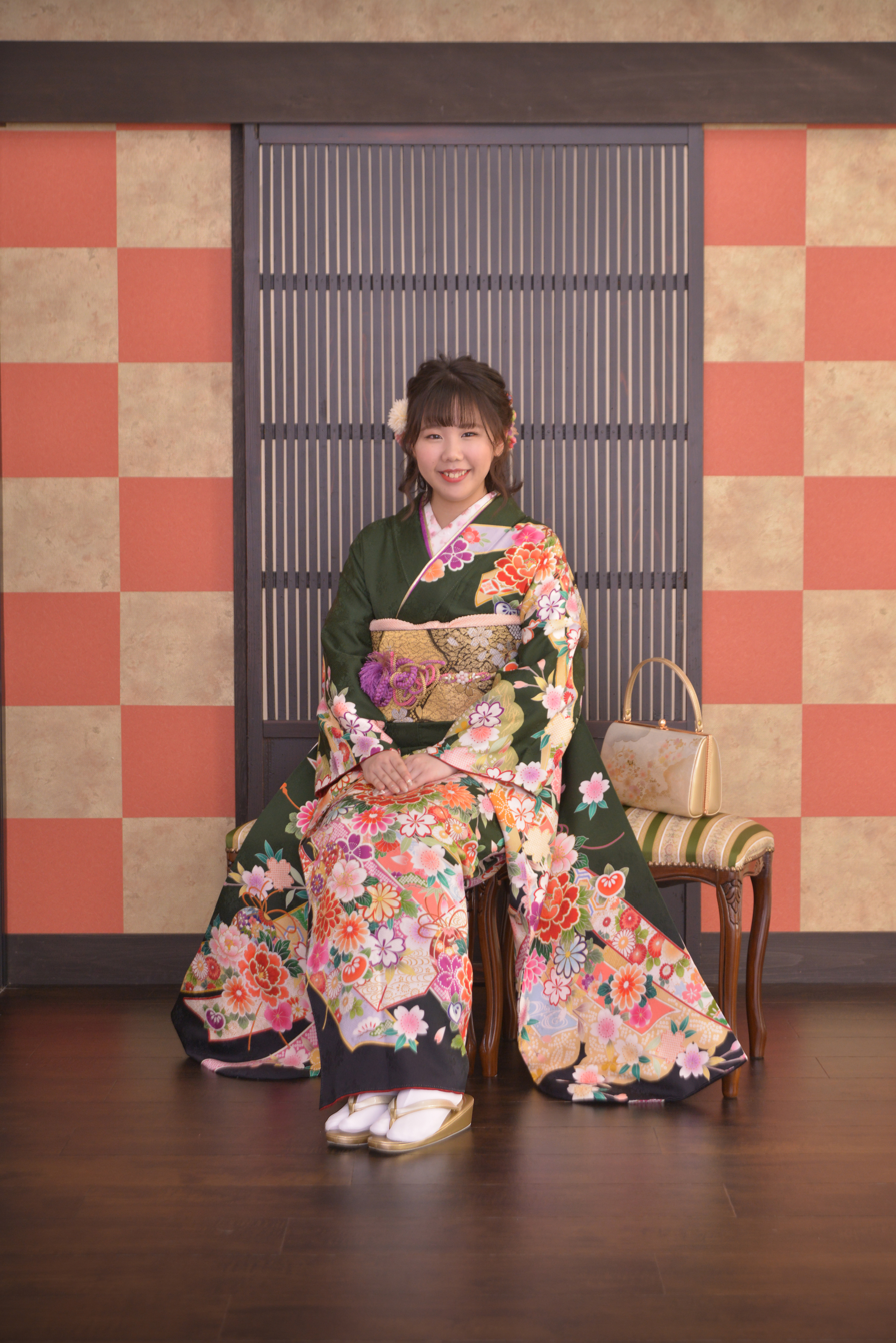 最近人気の深緑のお振袖を当店でレンタルして頂きましたが、