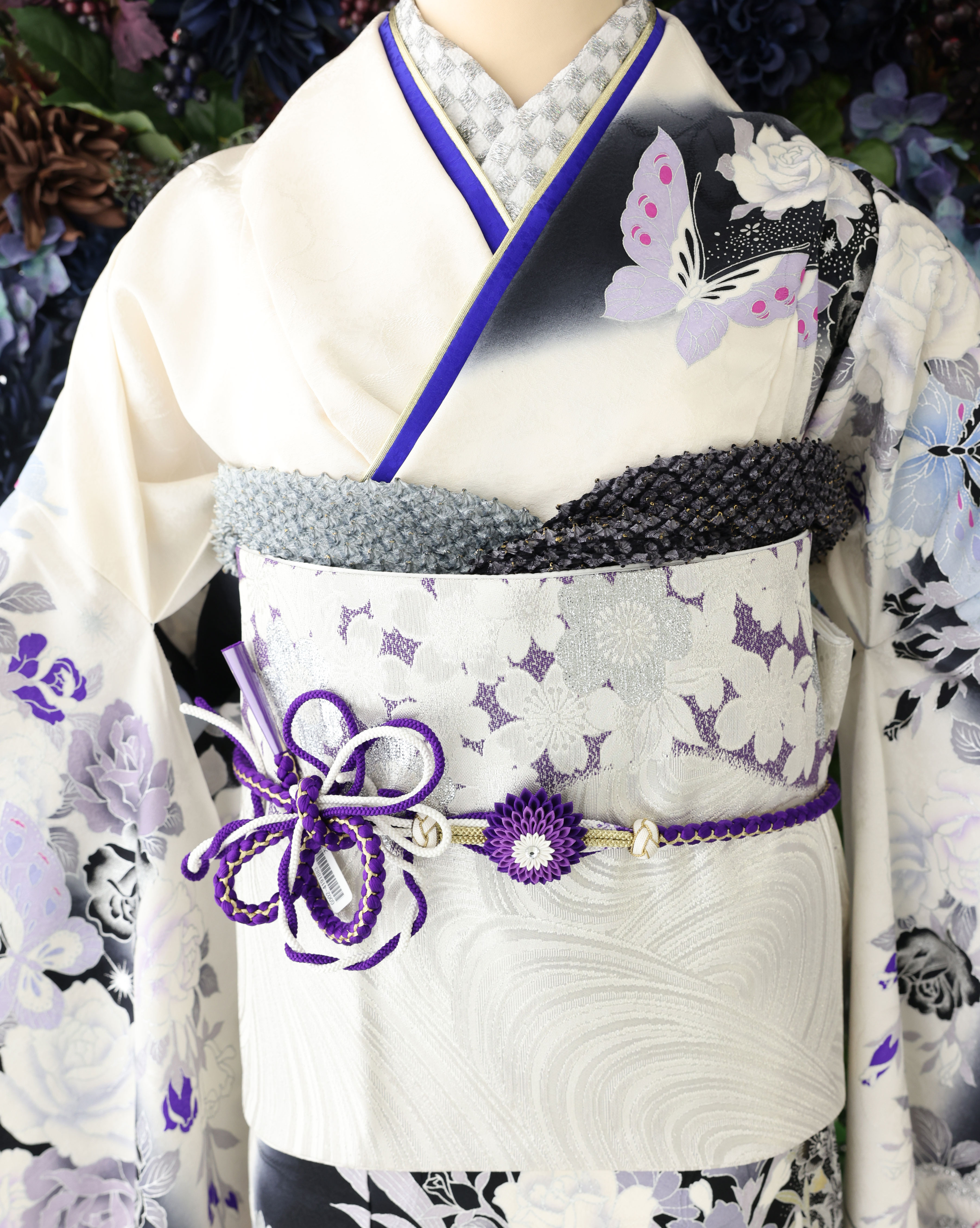 重ね衿や帯締めは紫にしてスッキリとした大人な感じにまとめてみました。