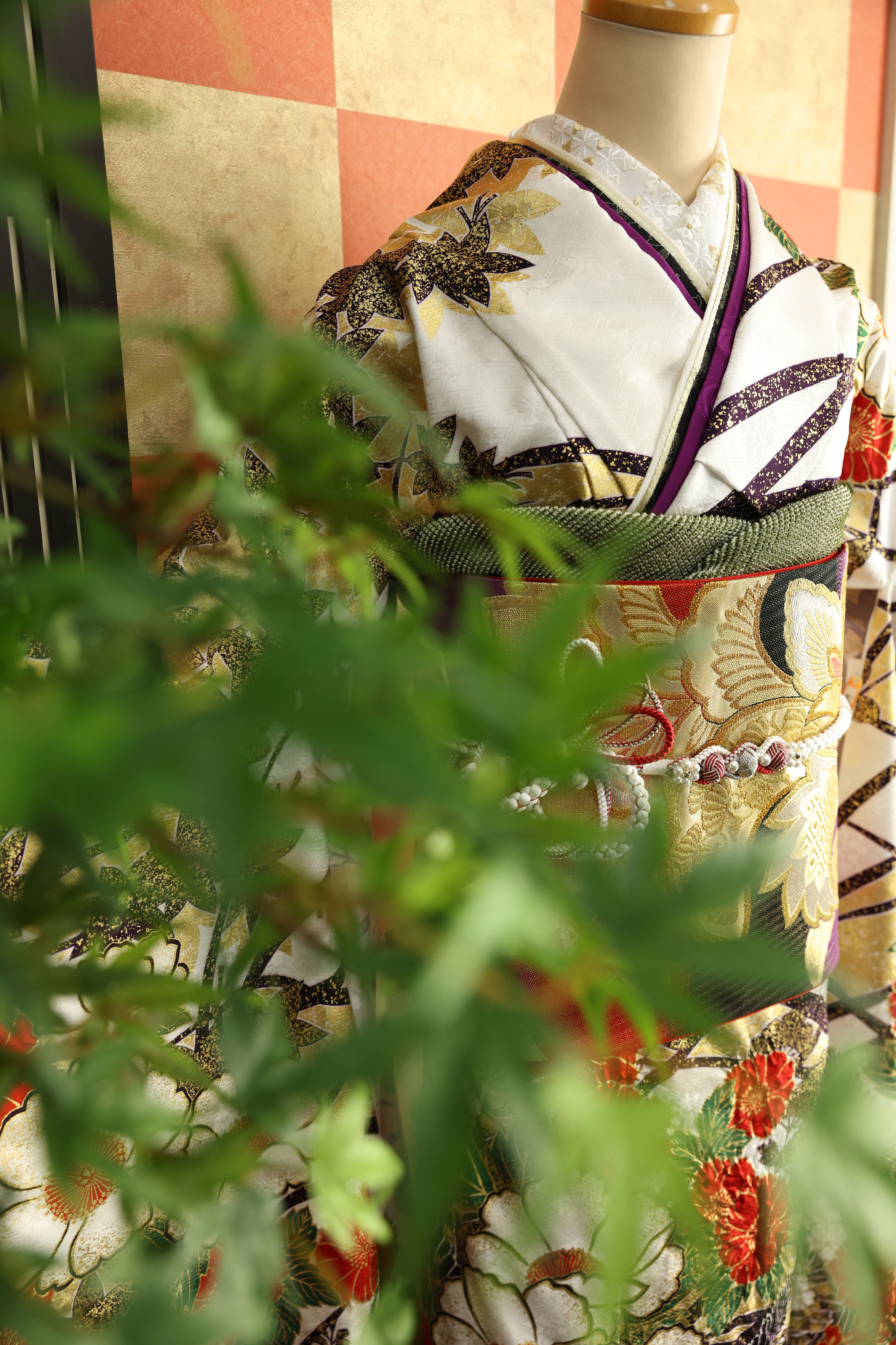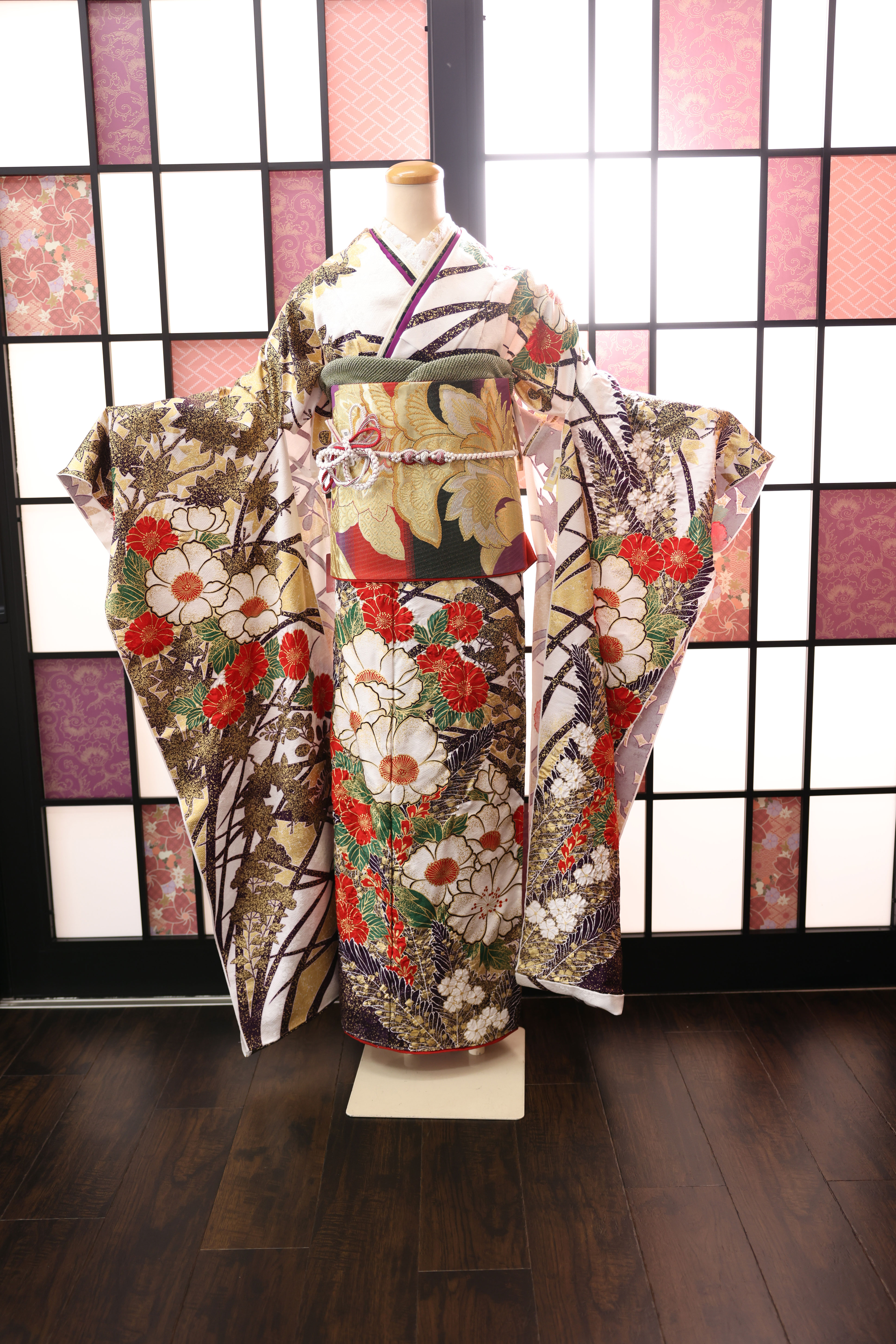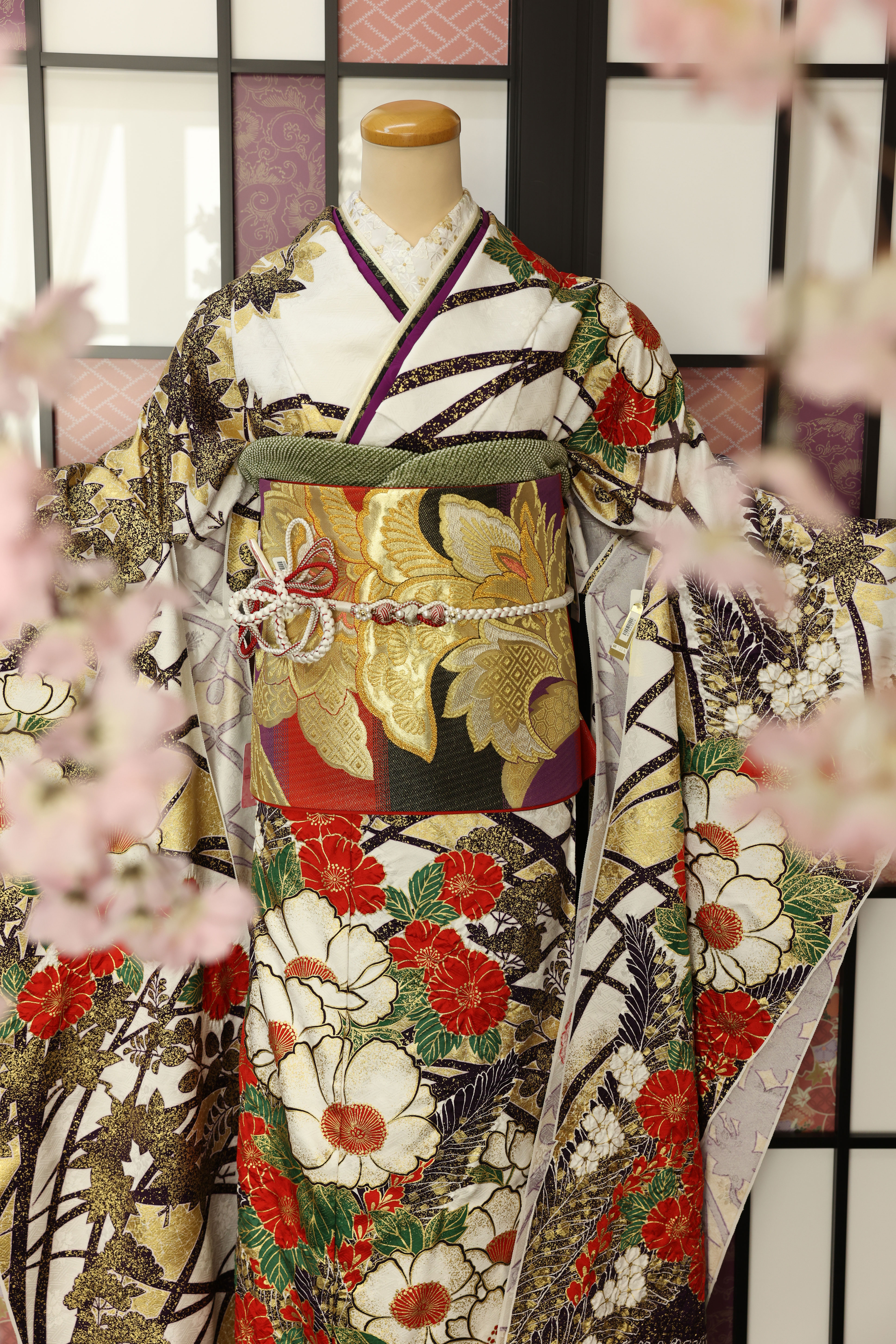 白地で黒・赤・金をメインにしたかっこいいお振袖です。