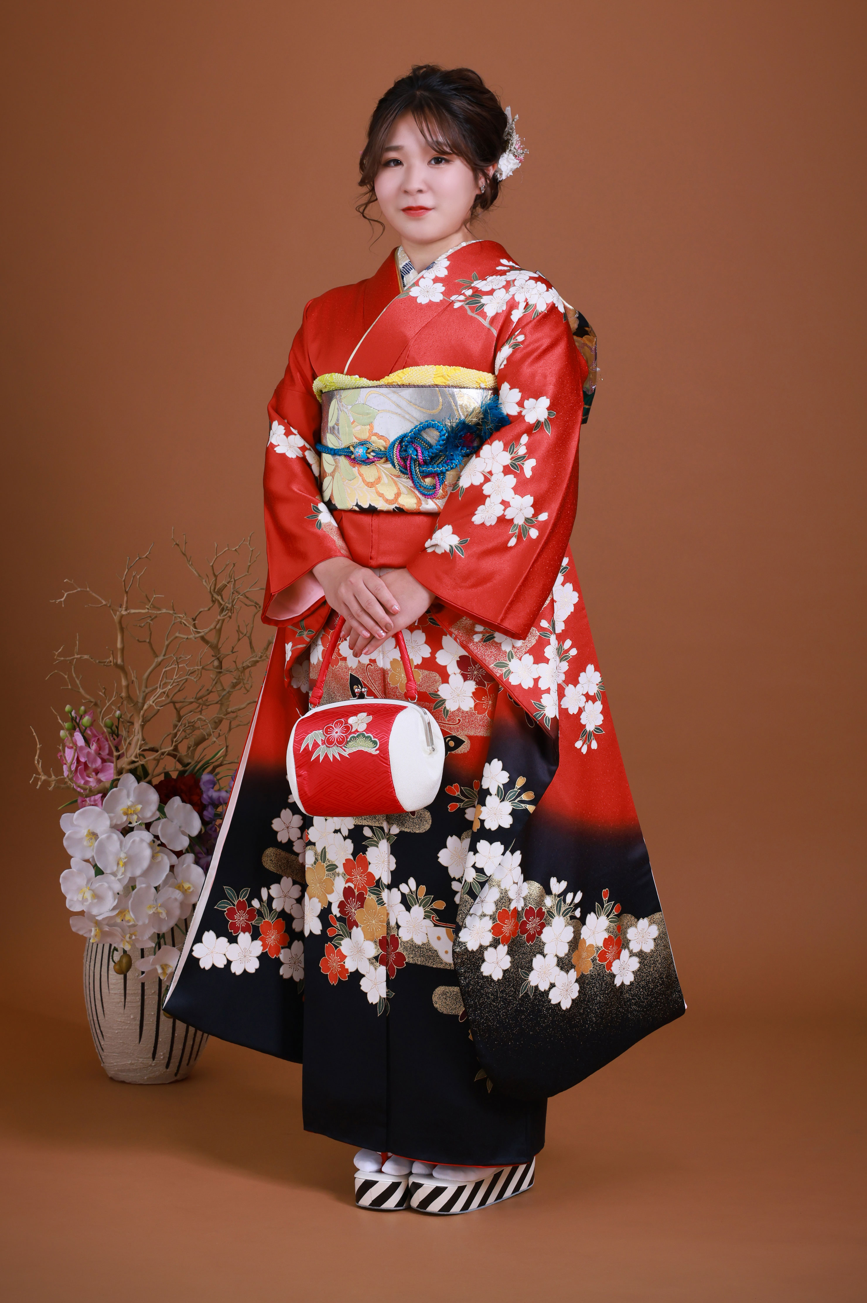 赤色の振袖に桜の柄がとっても似合う、可愛いお嬢様ですね♪