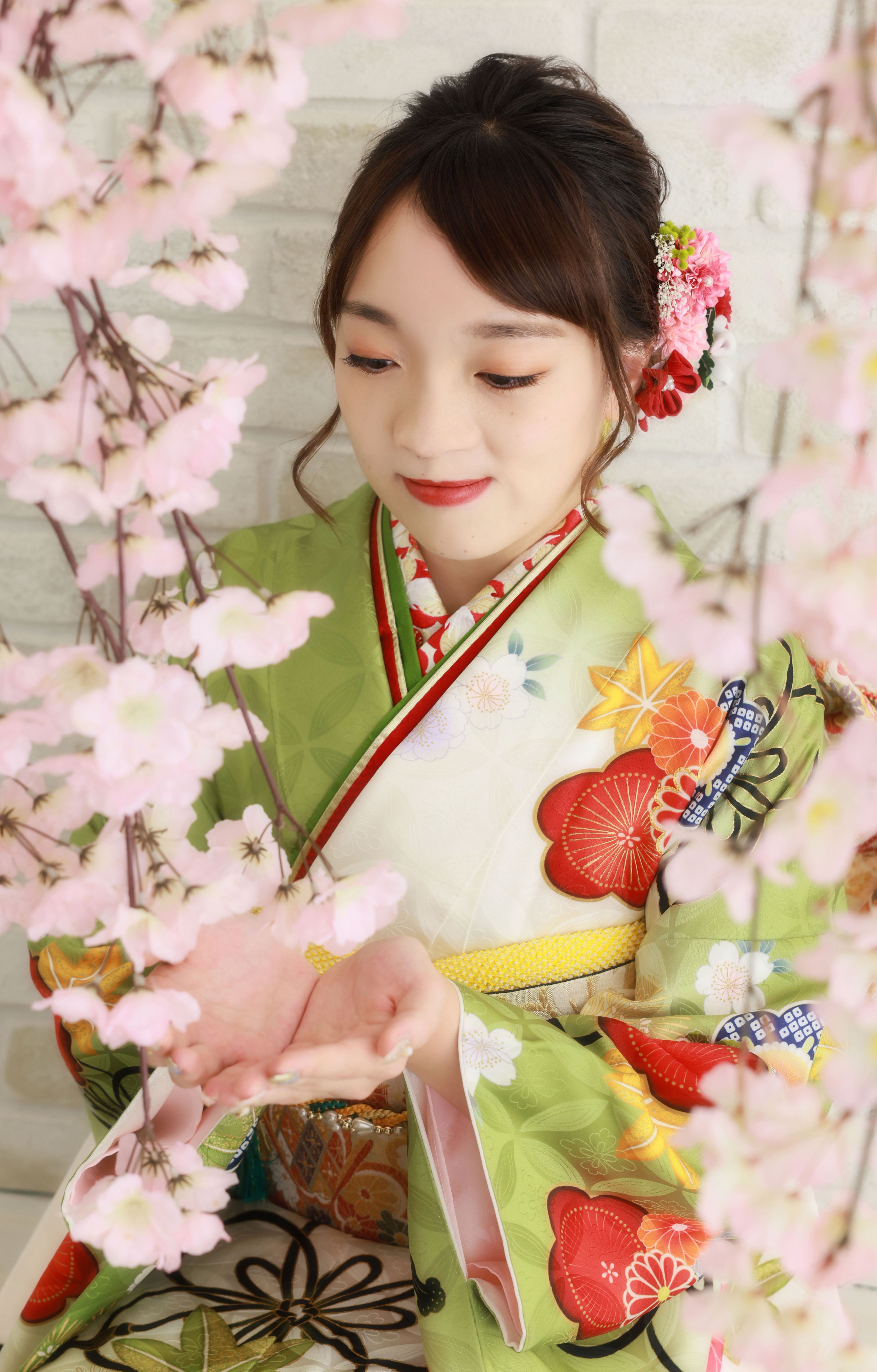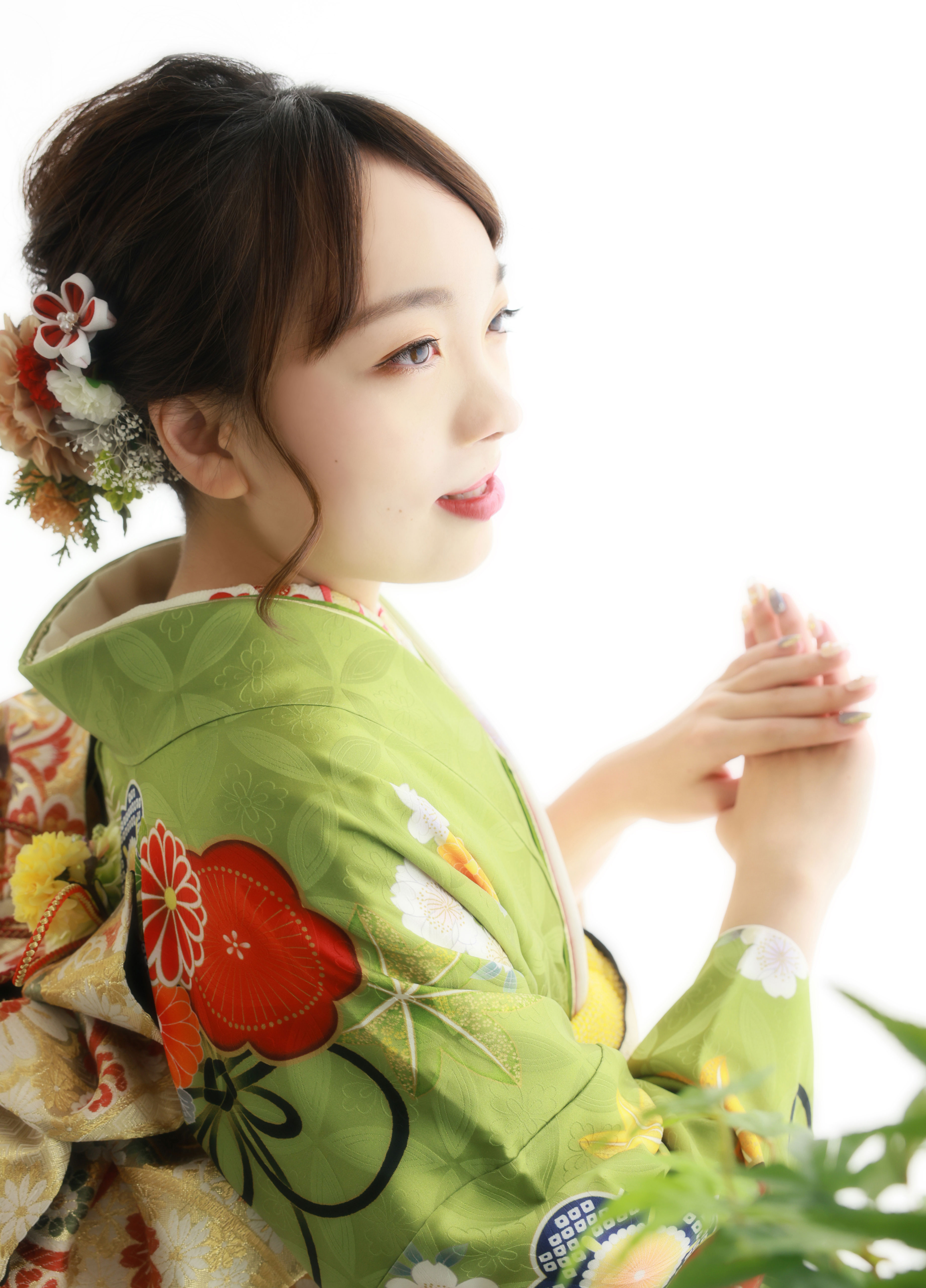 綺麗な緑と白の振袖でとっても可愛いですね♪
