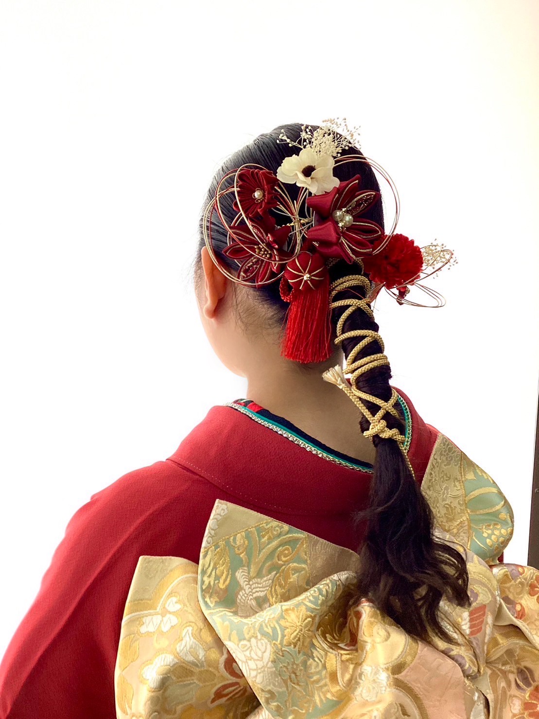 左右の髪を入れ違いで編んで、水引を巻きつけています(*^^*)