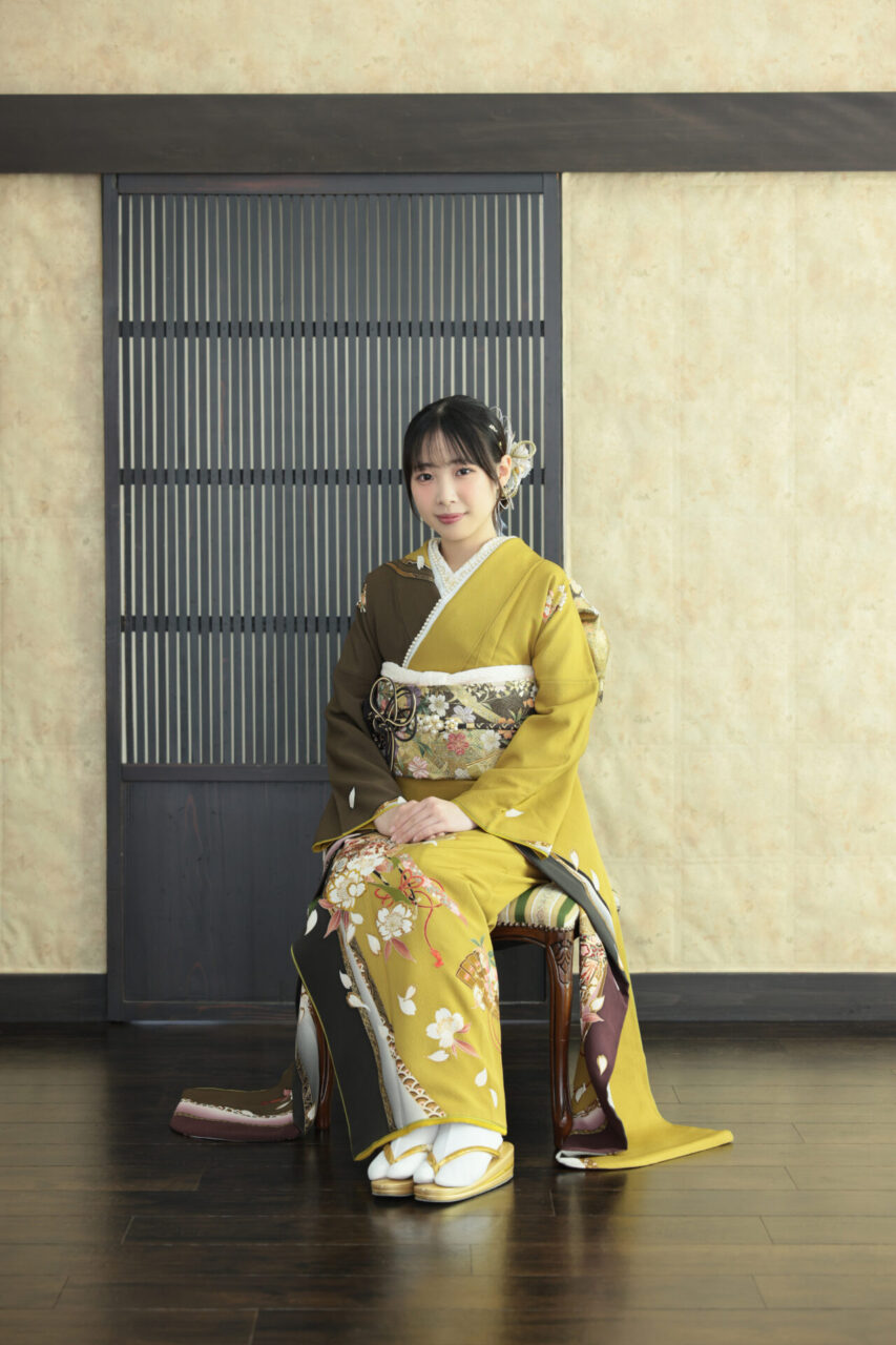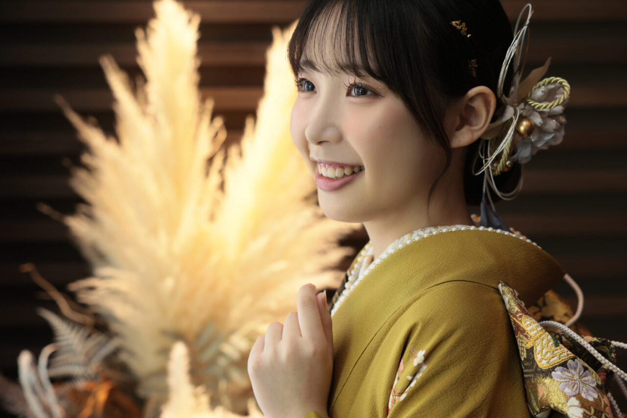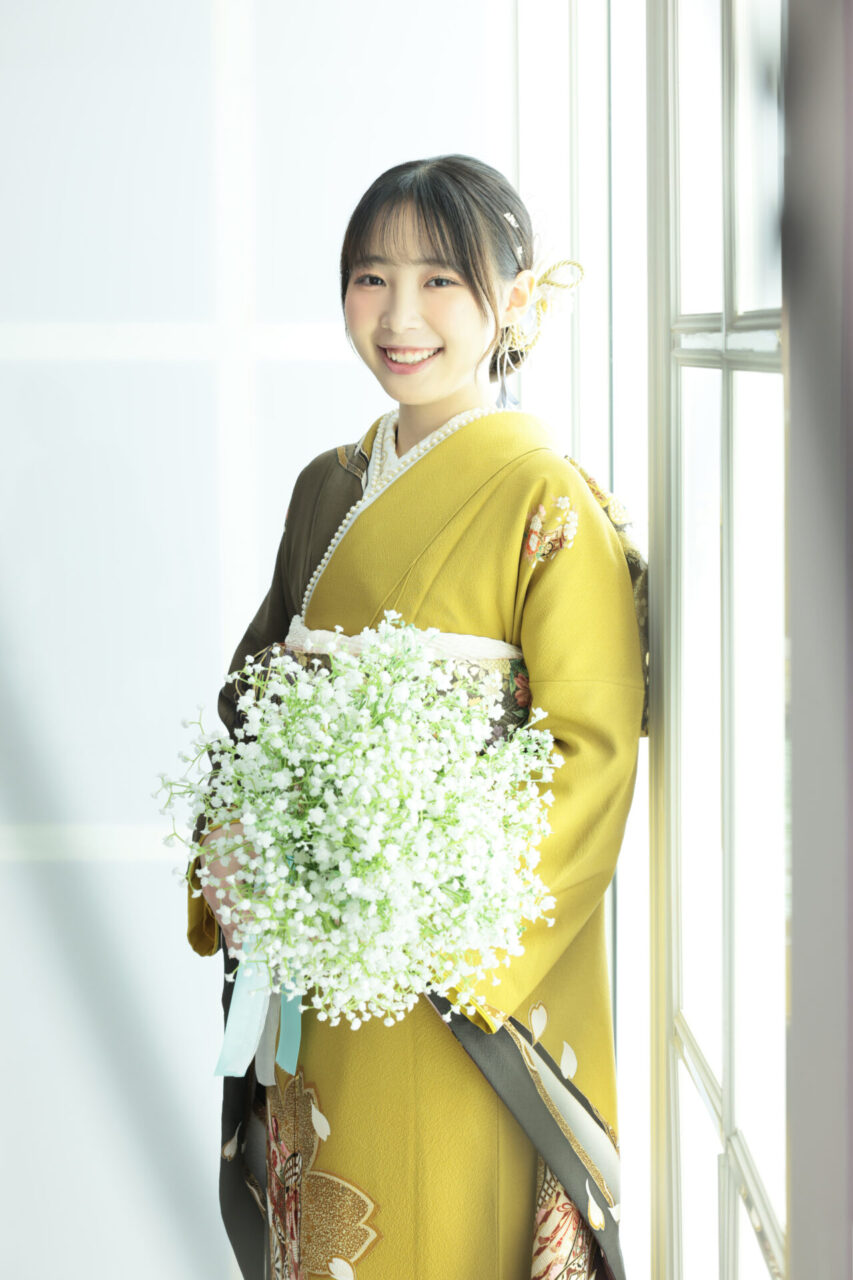 白色の小物を合わせていただくことで、すっきりな印象に。髪飾りも金と白を使用して頂いたので、全体的にまとまりのあるコーディネートになりました。
