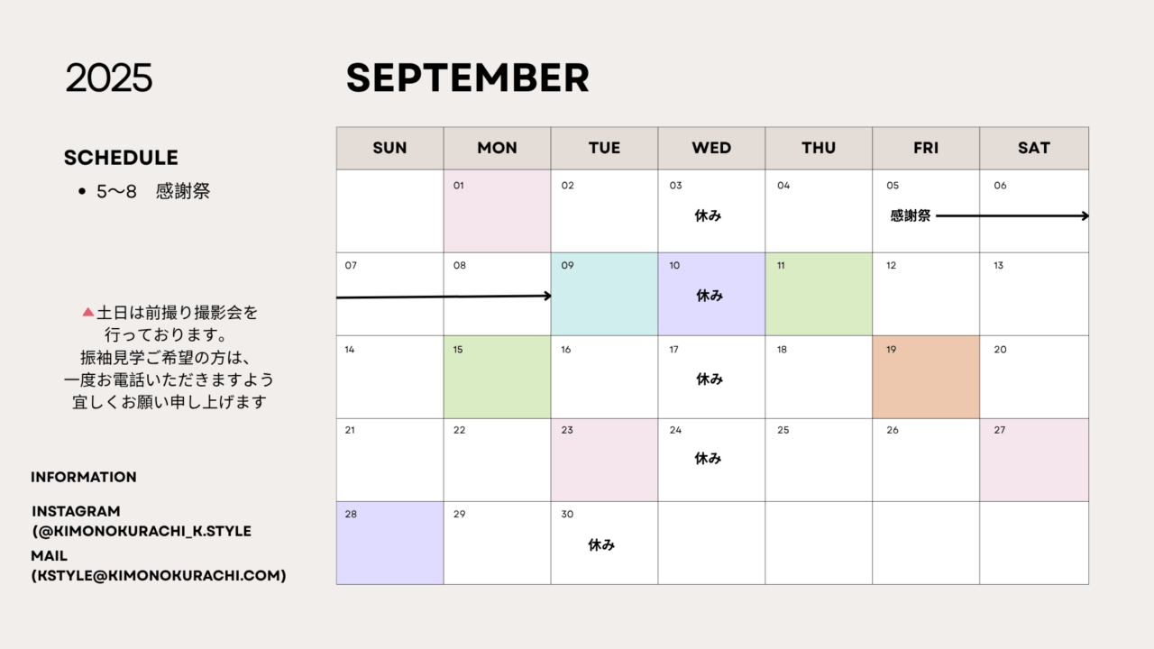また、土日は振袖の前撮り撮影会を開催しておりますので、混雑が予想されます。振袖見学の際は事前にご一報いただけると幸いです。