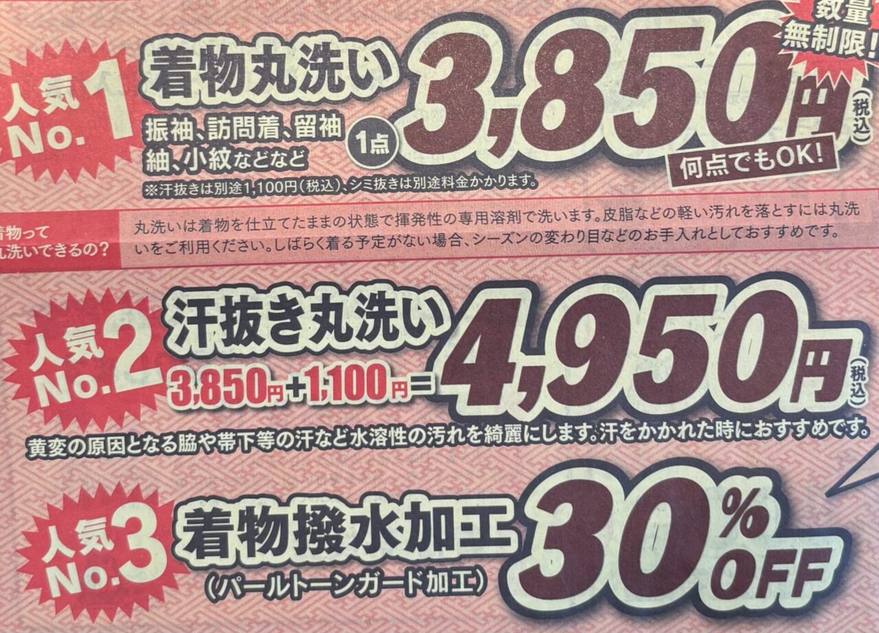 通常、お着物を洗っていただく場合、8000円~10000円ほどかかってしまします。しかし、この期間中に持ってきていただくと、どんなお着物でも3850円で洗えてしまうんです!オトクでしょ?