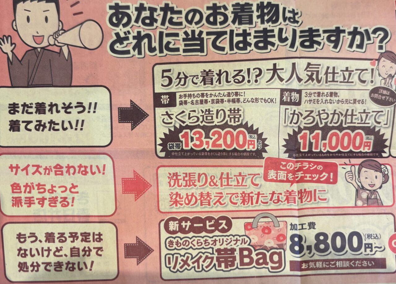 また、3分で着物が着れちゃう仕立てや、お太鼓が簡単にできる加工も人気です!そしてそして、もう着る機会がない帯たちを生き返らせる、リメイクバッグも!!思い出を手元に残しておける素敵な方法もございます!