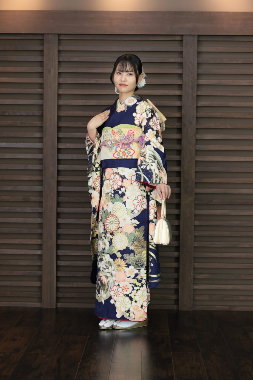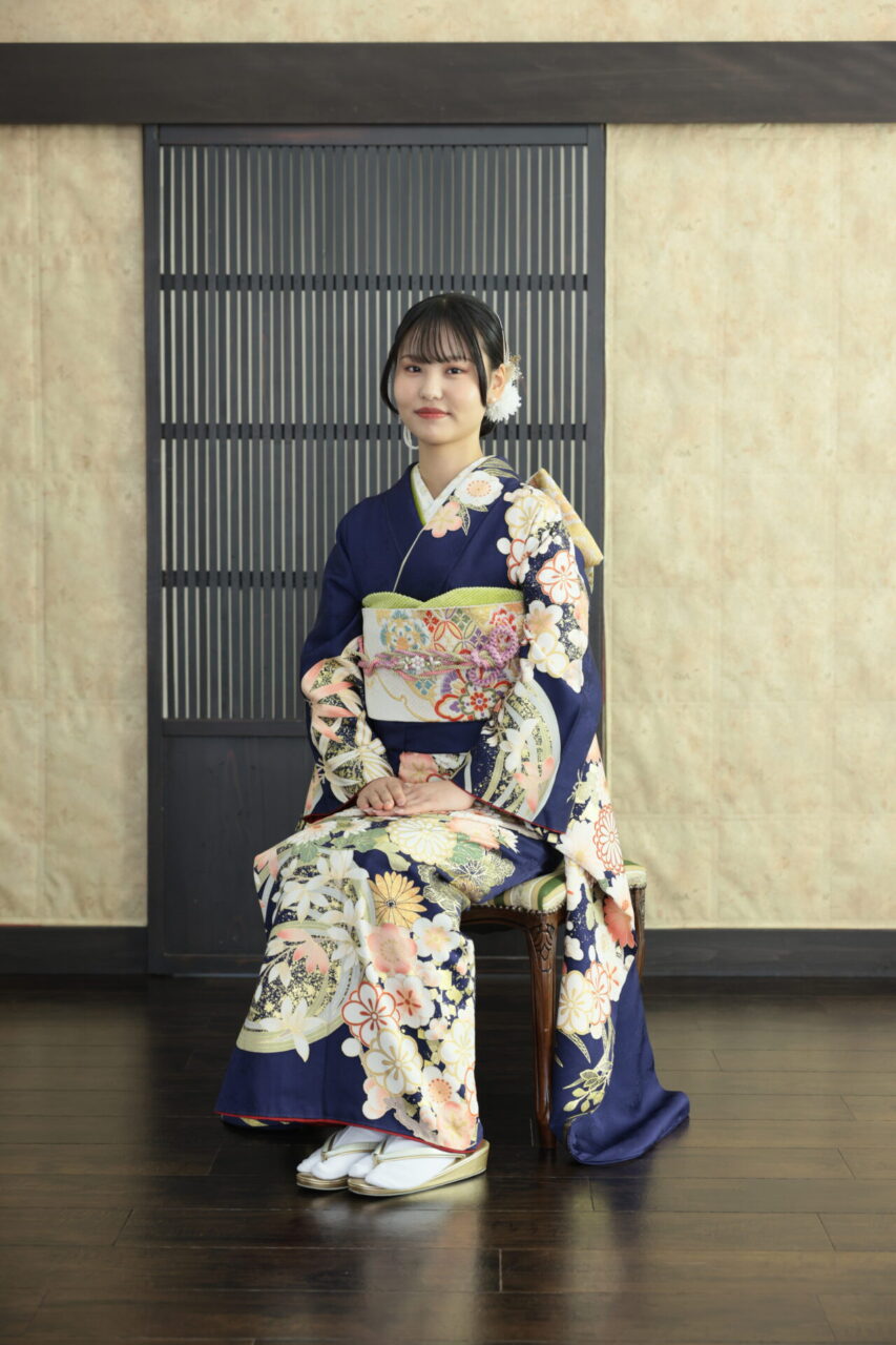 紺に白のお色で柄が書かれているこのお振袖。やわらかい雰囲気でまとめていただきました。
