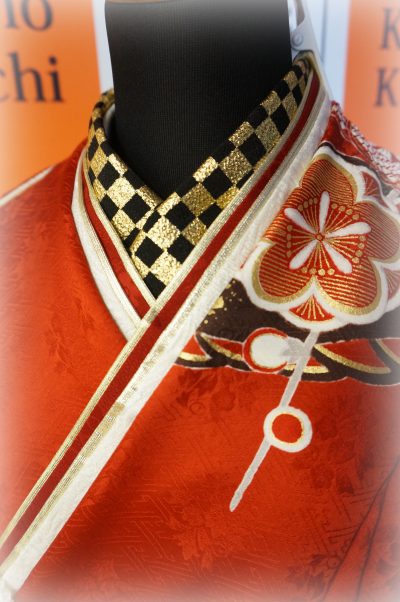 赤色のお振袖に、個性的な黒・金格子の半衿が可愛いんです!