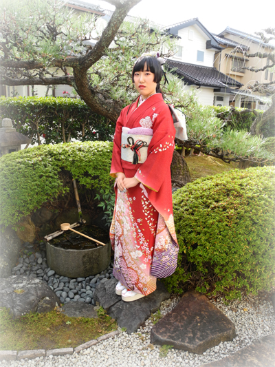 落ち着いた赤色のお振袖に、個性の光る髪形(^^♪