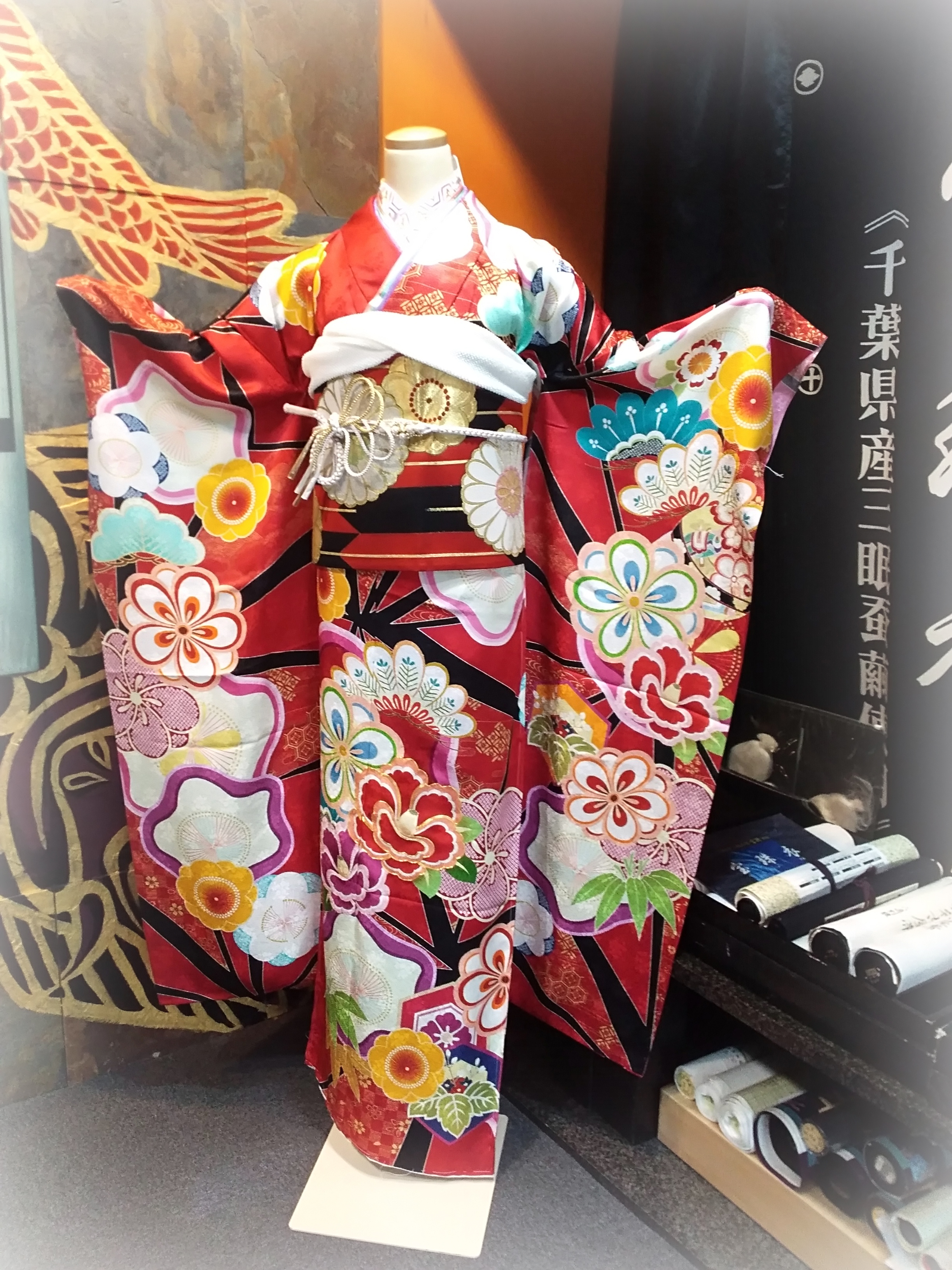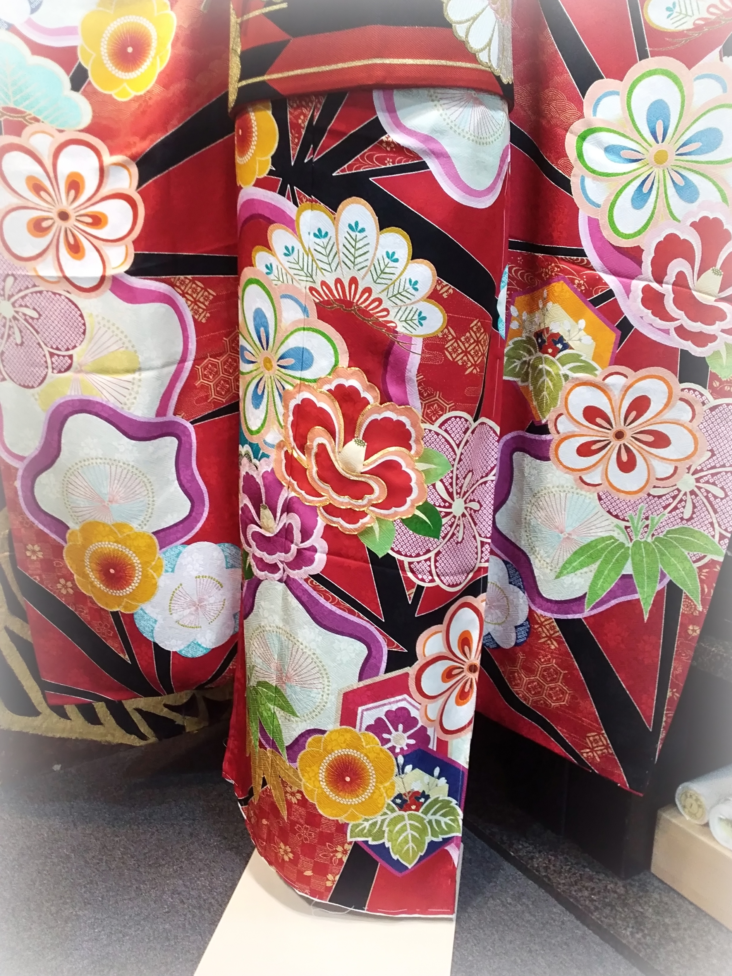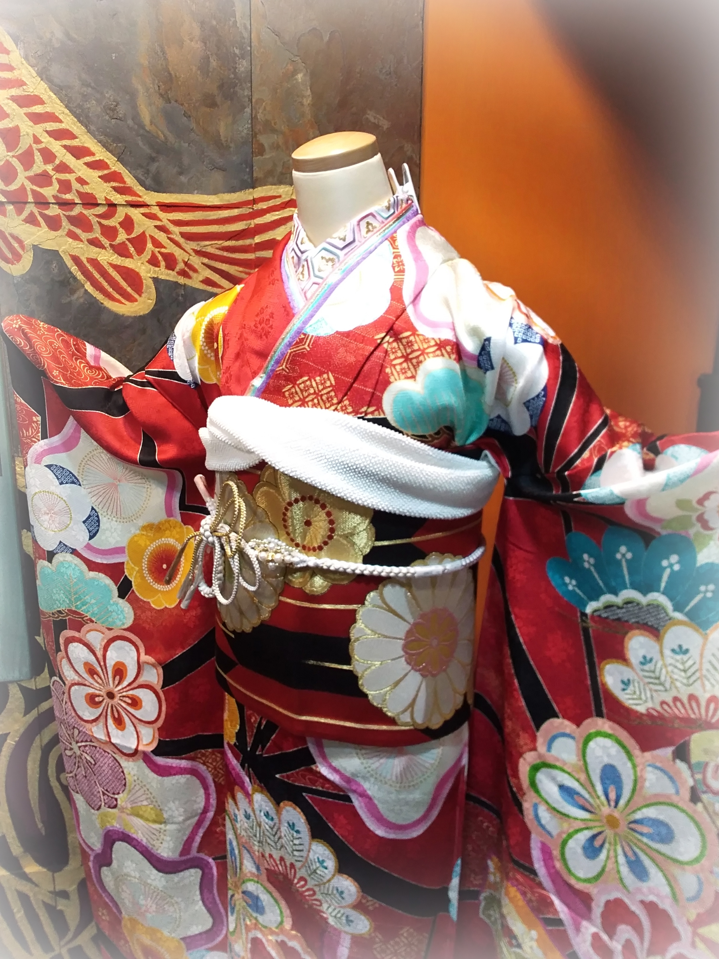 大柄の赤色の振袖、帯がとーっても個性的で可愛いですね。