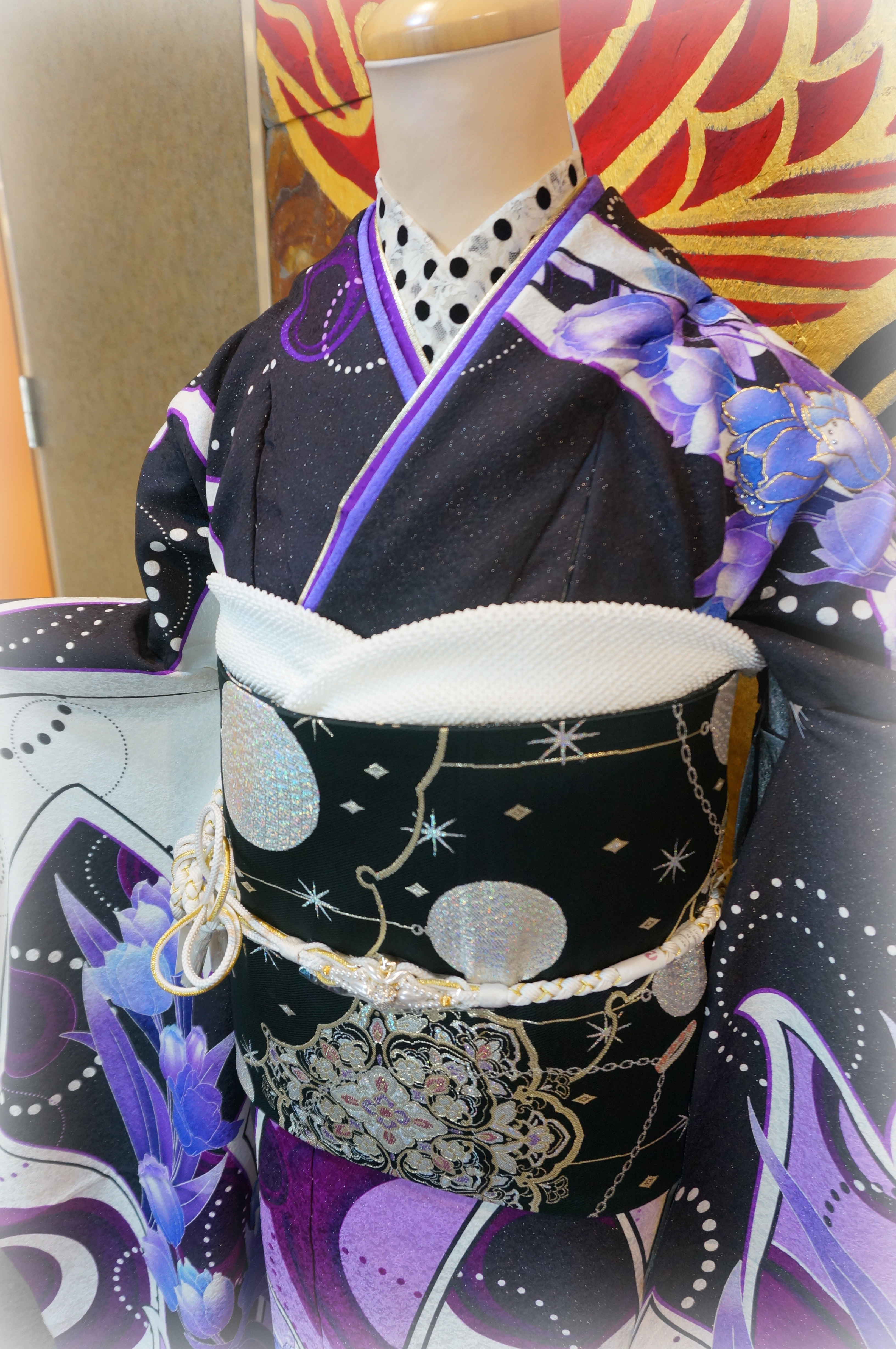 洋風な袋帯、水玉の半襟が個性を引き立ててくれます。