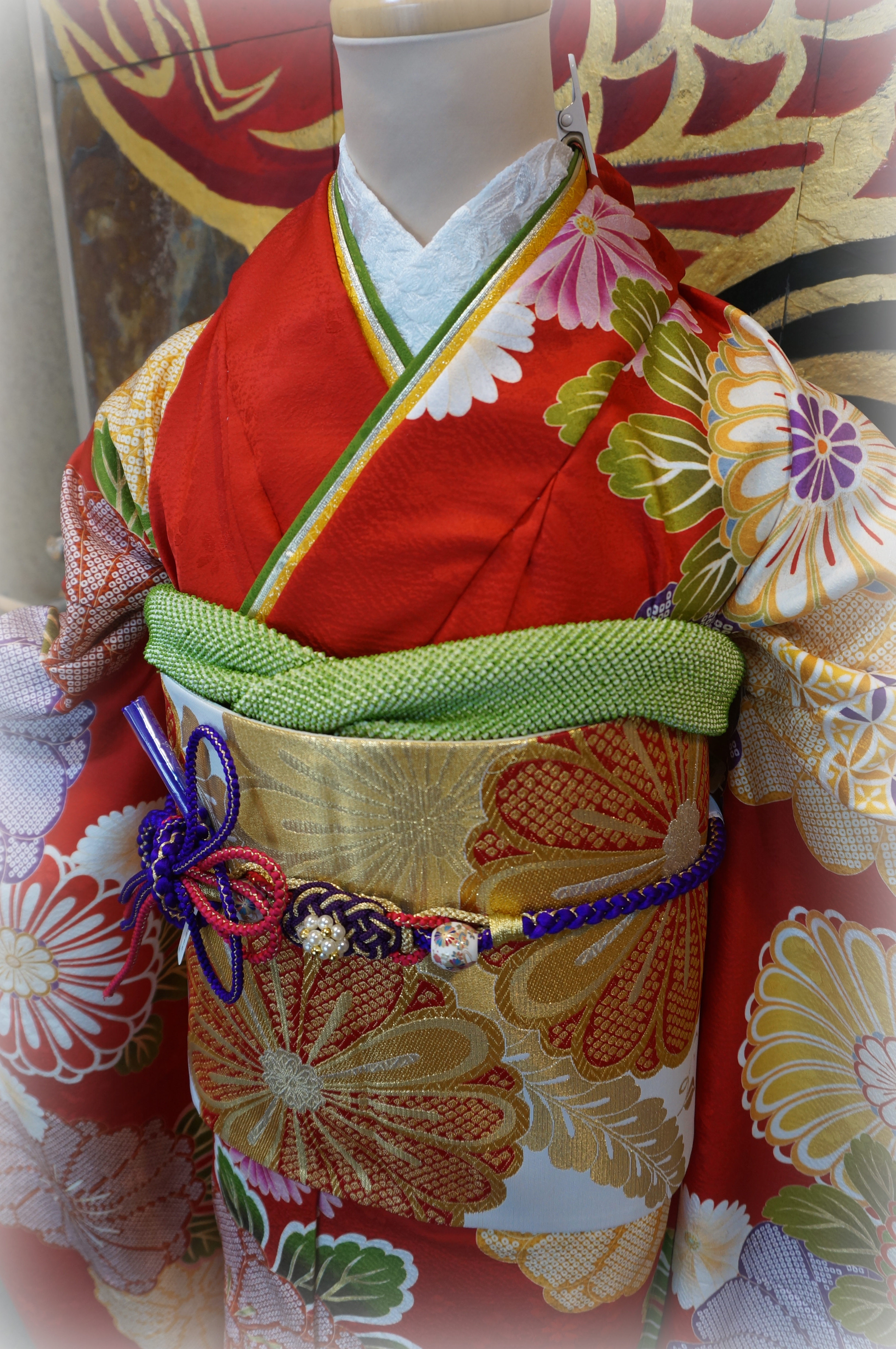 帯揚げと重ね襟に黄緑色を使用しましたが、赤色とは相性がいいなぁと思います。