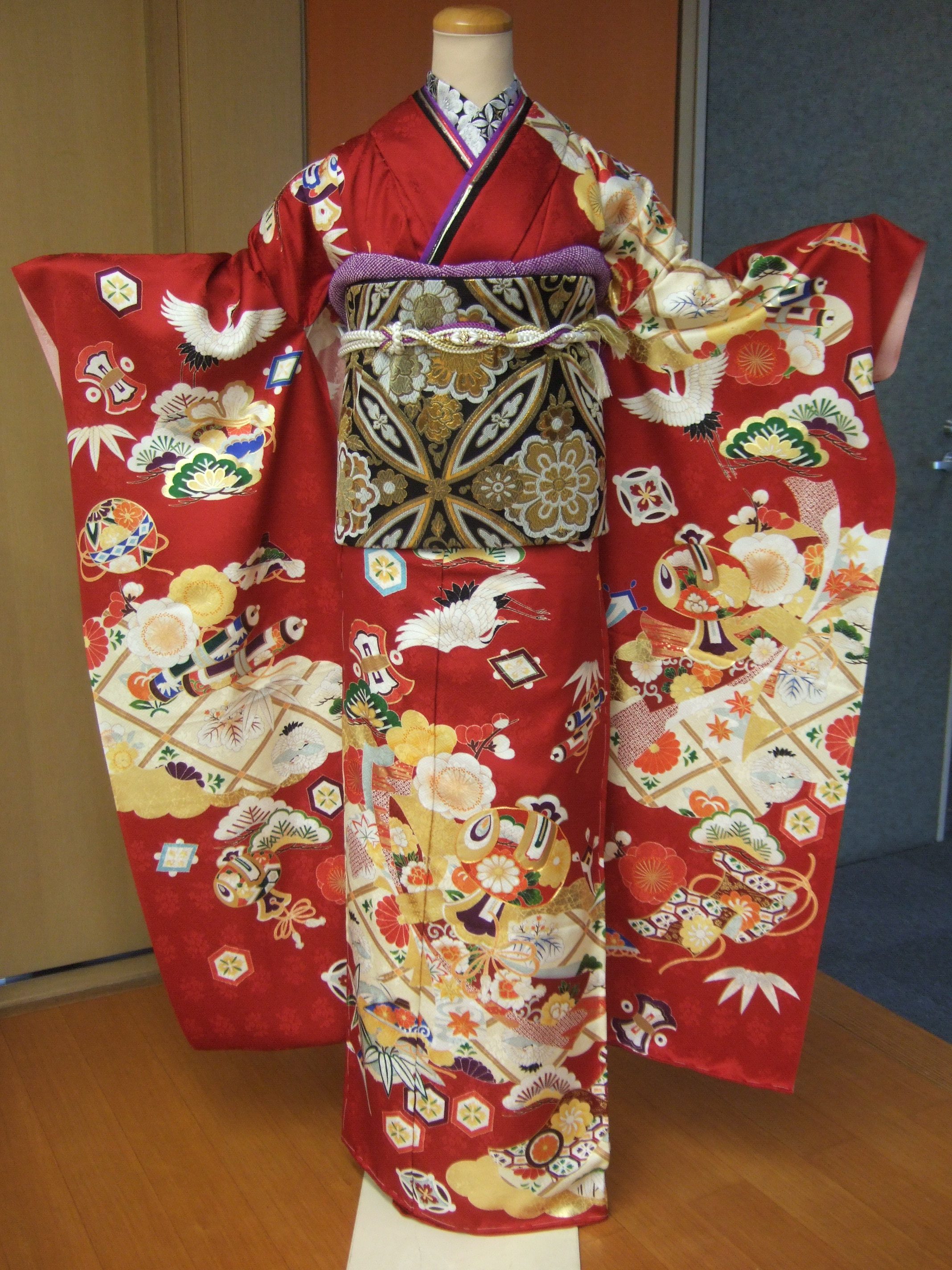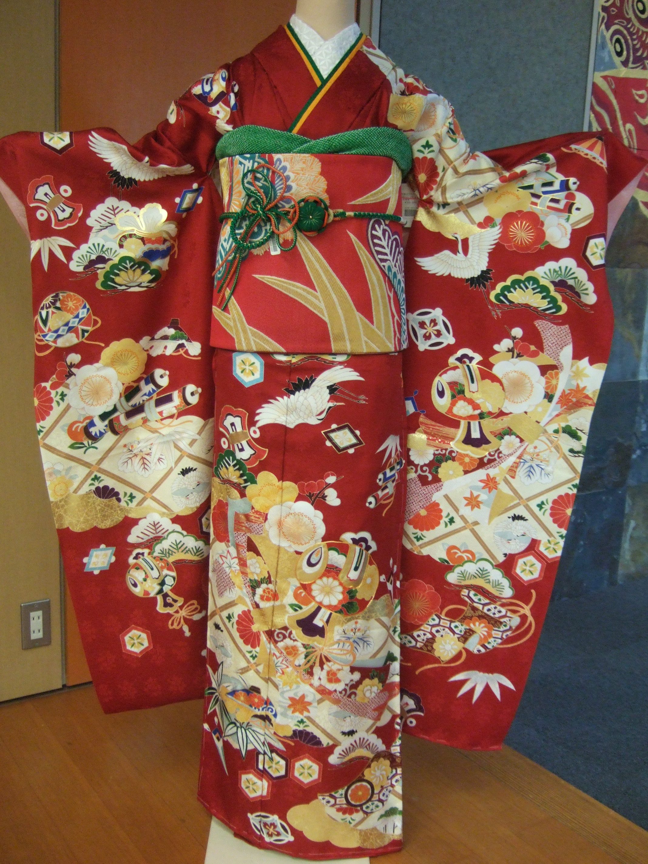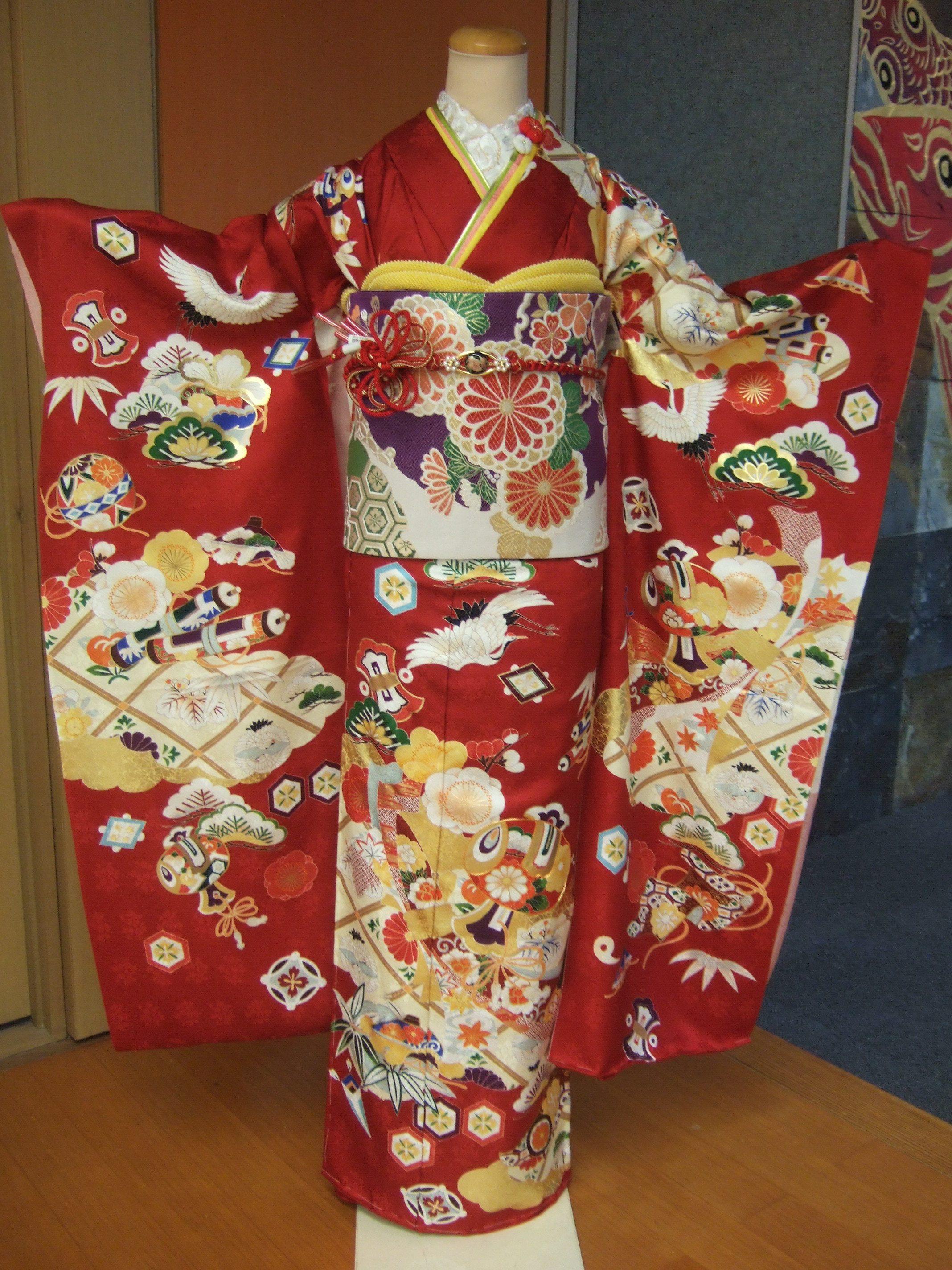 基本になる赤い振袖は、おめでたい吉祥文様がちりばめられた着物です。