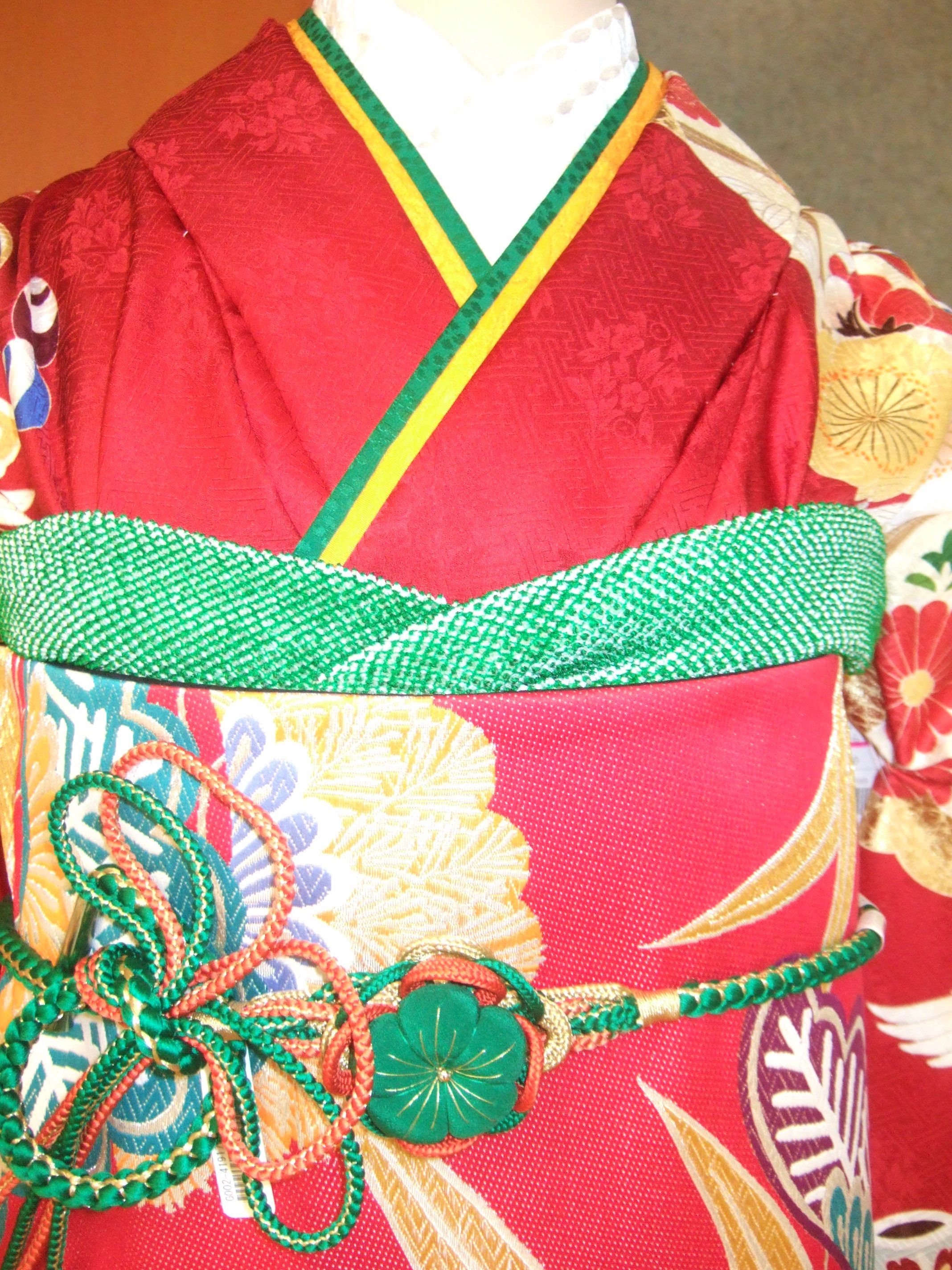 着物も帯も赤色にして、緑色を挿し色にして、まとめました。