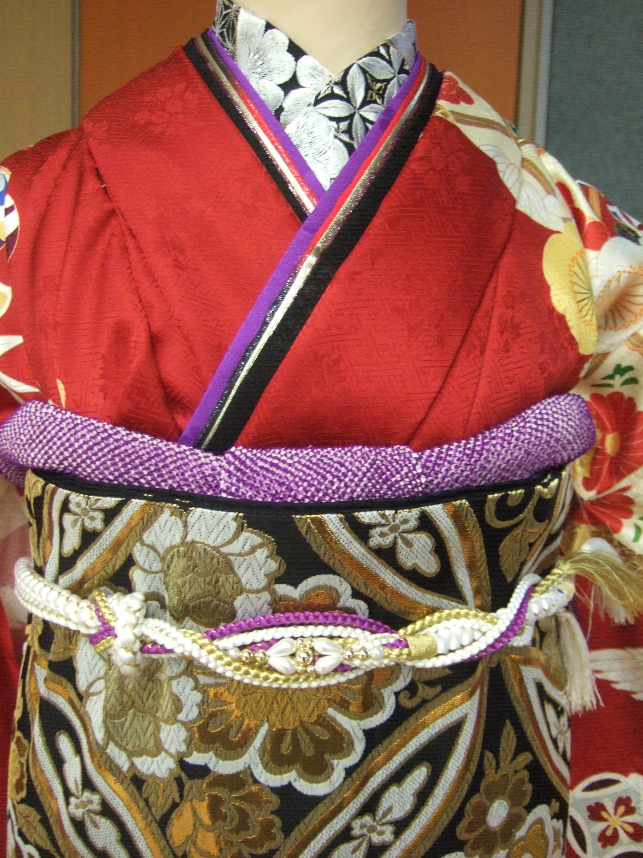 基本になる赤い振袖は、おめでたい吉祥文様がちりばめられた着物です。