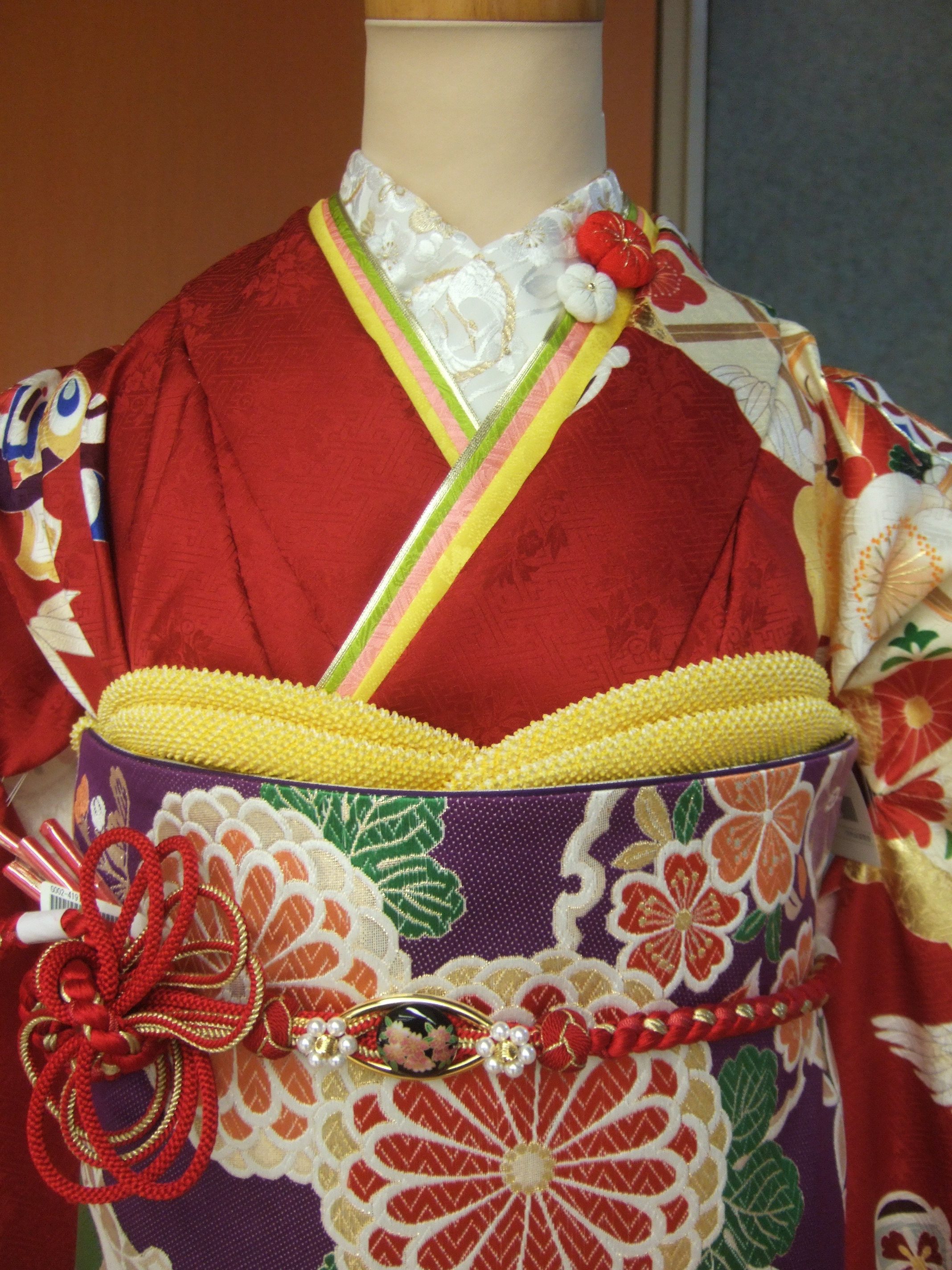 着物も帯も赤色にして、緑色を挿し色にして、まとめました。