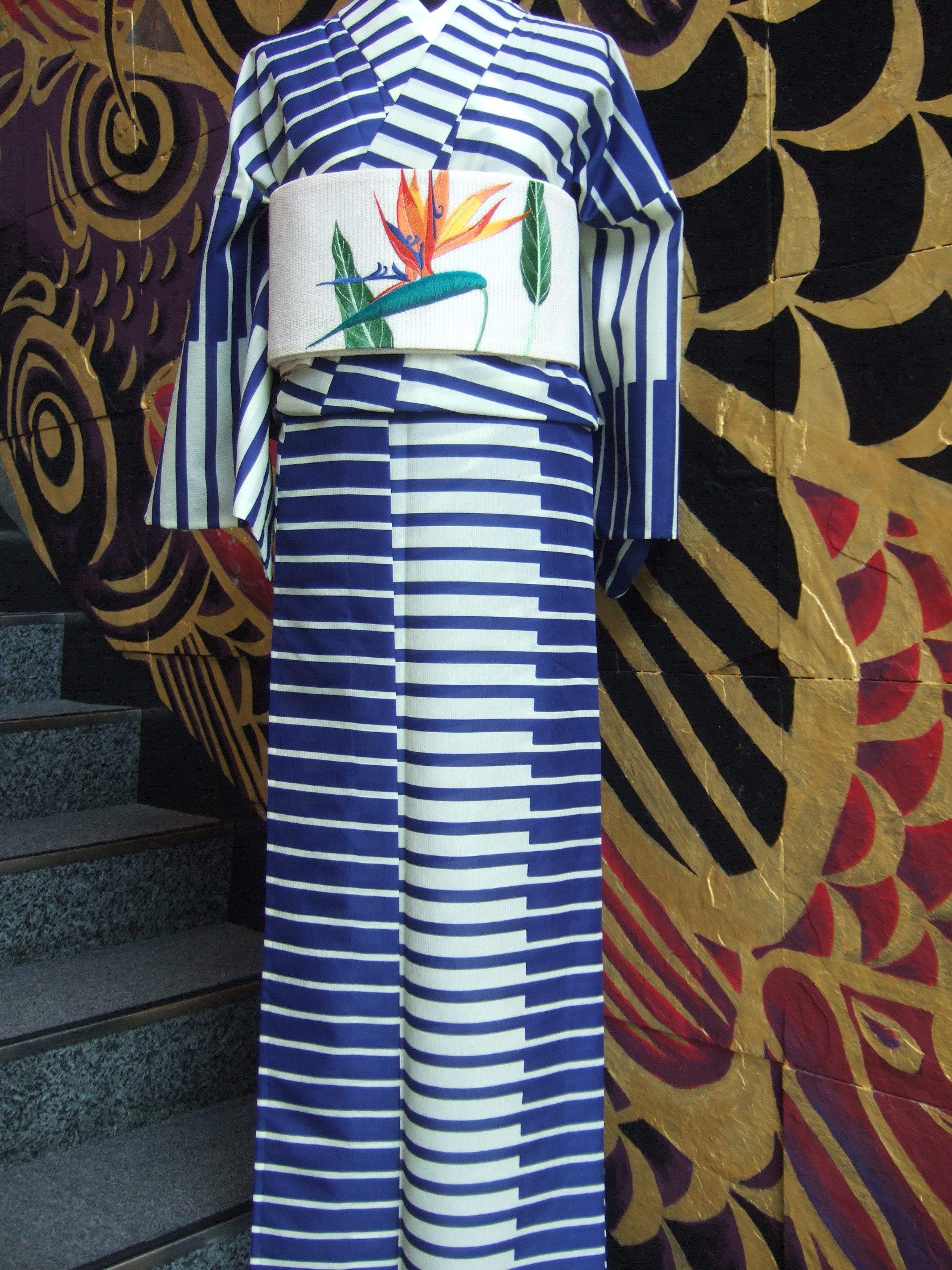 セオアルファというサラリとした感触の生地で、変則な横縞の浴衣に、透け感のある絽でできた、南国鳥花の刺繍の半巾帯を合わせた、南国風な着こなしコーデをしてみました。