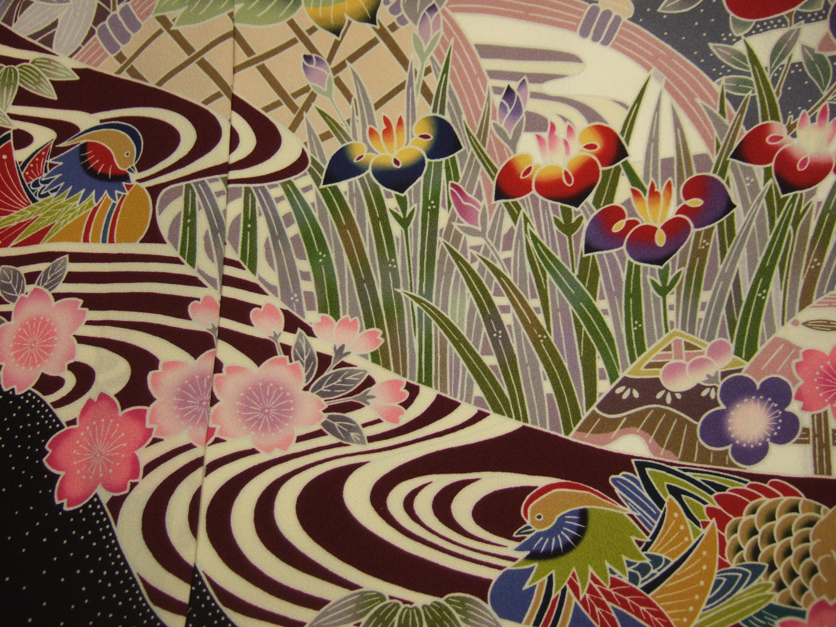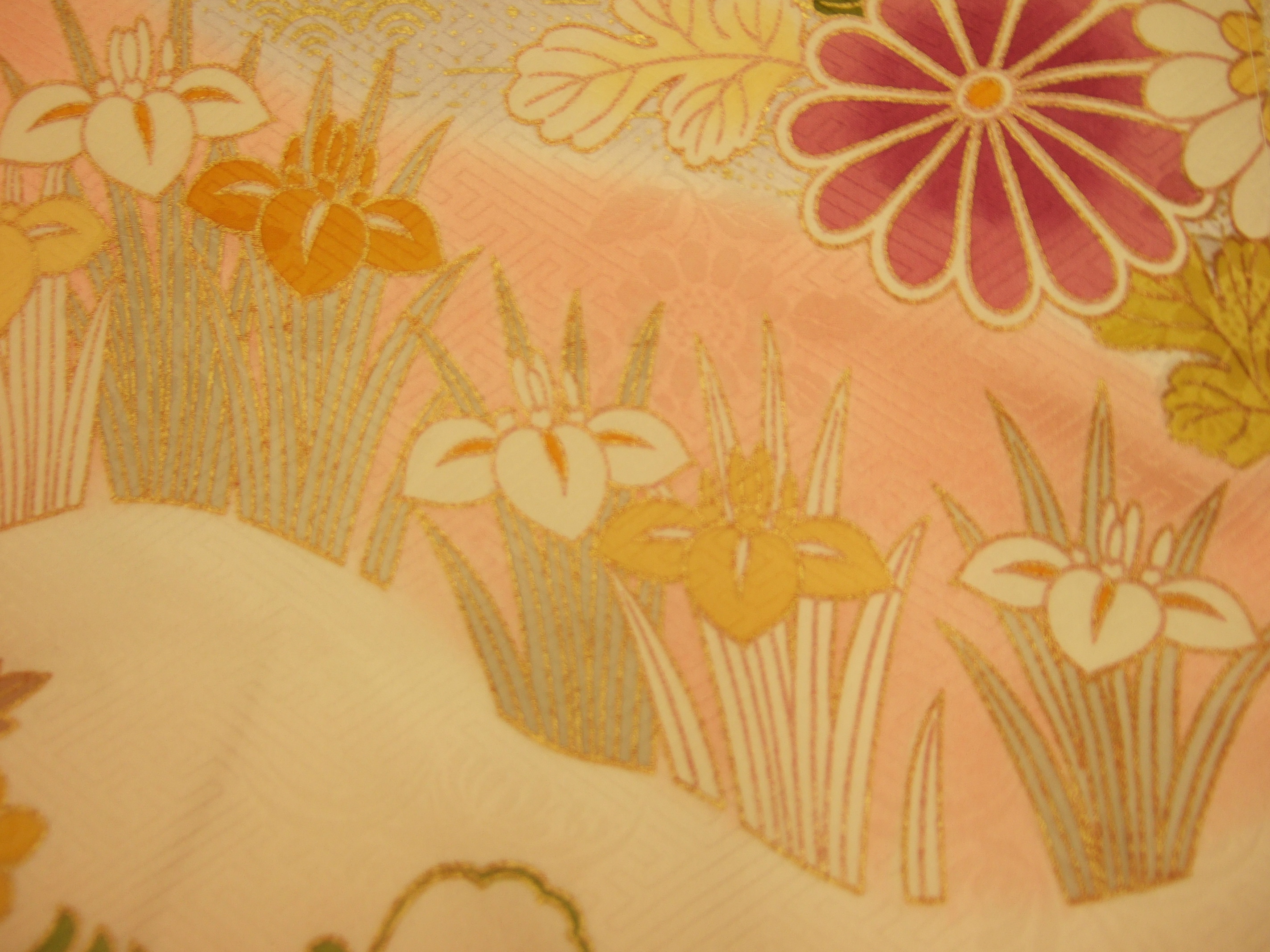 数日後、私たちの結論は、着物の文様の本にありました。『いずれあやめか、カキツバタ』というように、あやめも、花菖蒲も、杜若、いずれも優れており、優劣がつけられないほど素晴らしいということなので、花姿は花菖蒲に似ていても、八橋と一緒に描かれているものは、杜若になるということでした。そういえば、振袖にも模様がありますが、中央部分が白でもなく、黄色でもなく、カラフルであったり、金色のものが八橋や、水辺ととともに描かれています。
