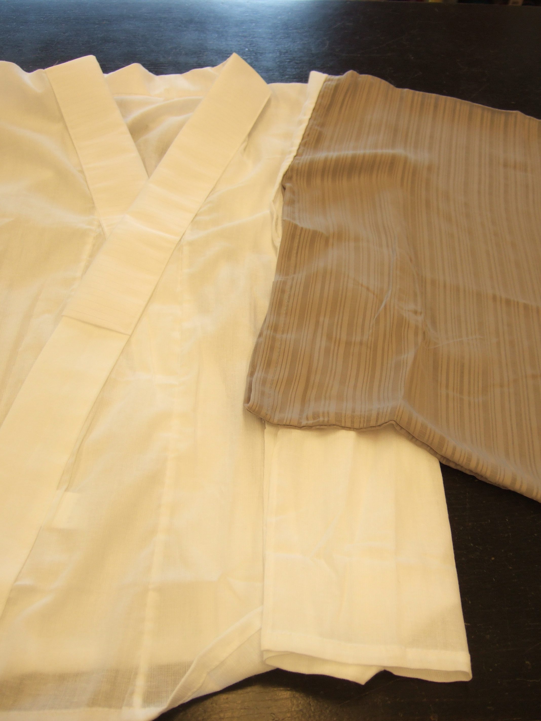襟と袖はついていますが、上半身は綿のちぢみ織りで透け感があり、汗を吸い取り、肌襦袢と長襦袢が合体したようなもの。