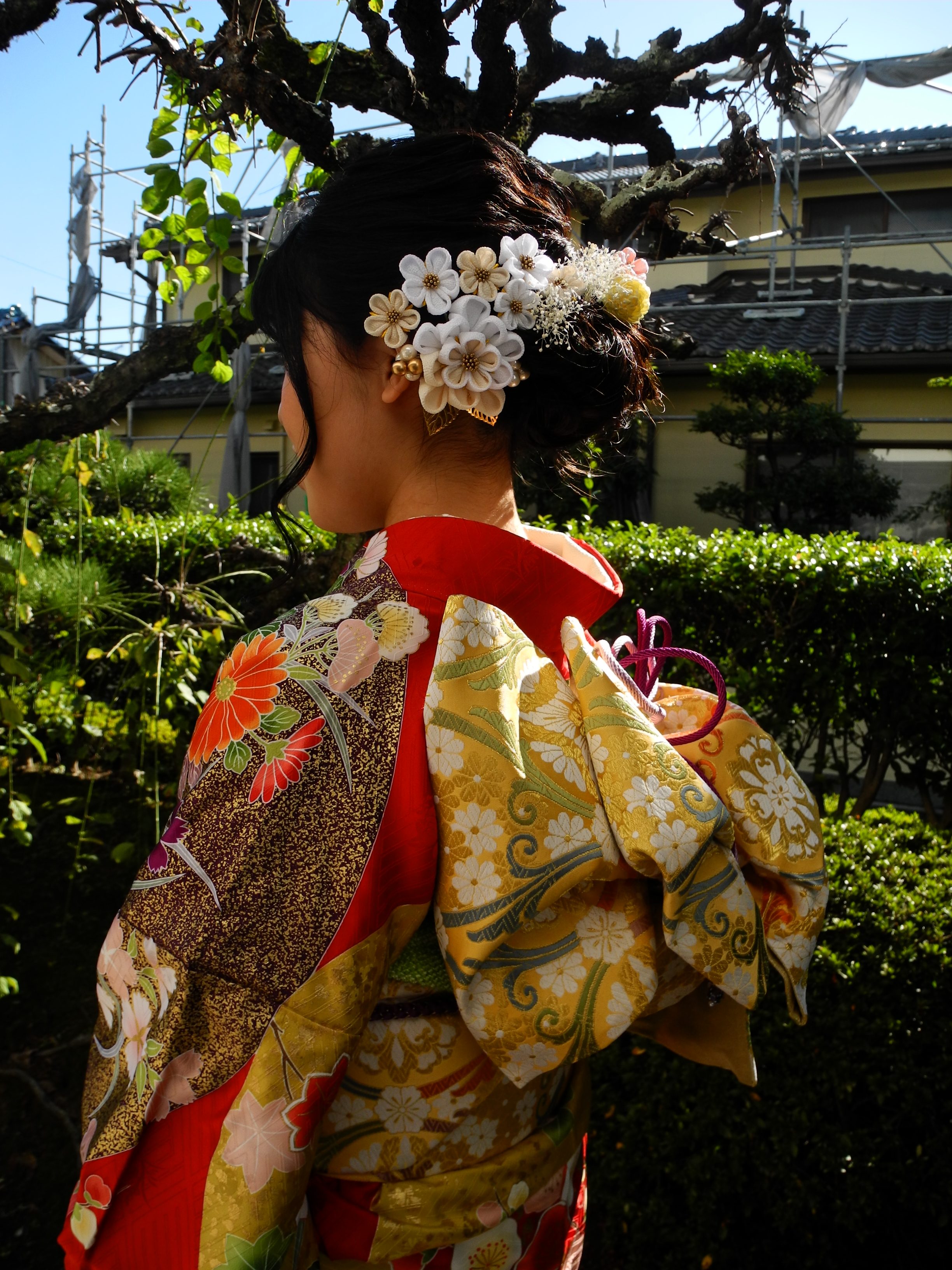 髪飾りも白、金のつまみ細工のカワイイものを選んでいただきました。