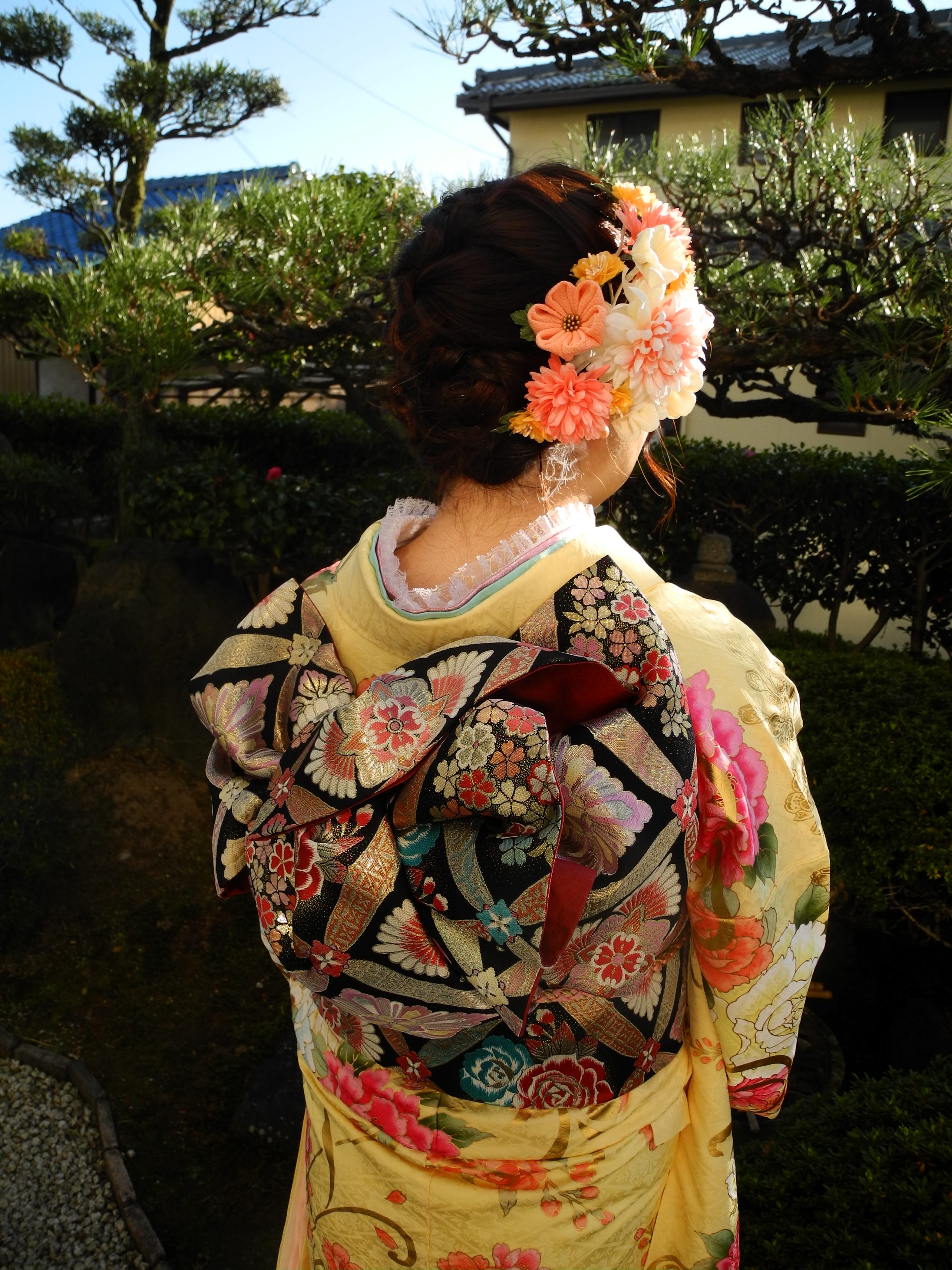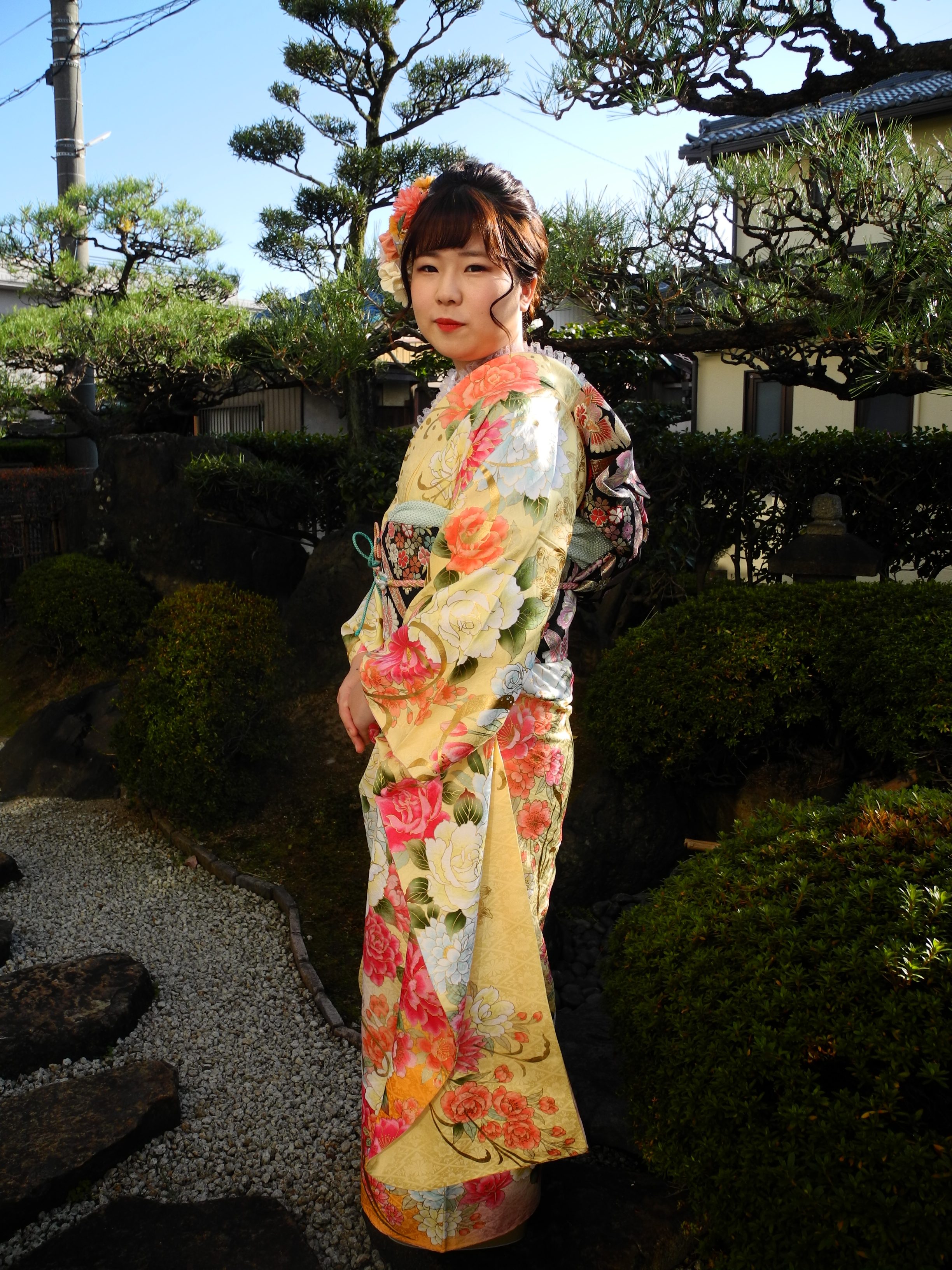 今回の妹様は、綺麗な黄色にピンク、オレンジ、水色などの色合いの可愛いバラのお振袖。