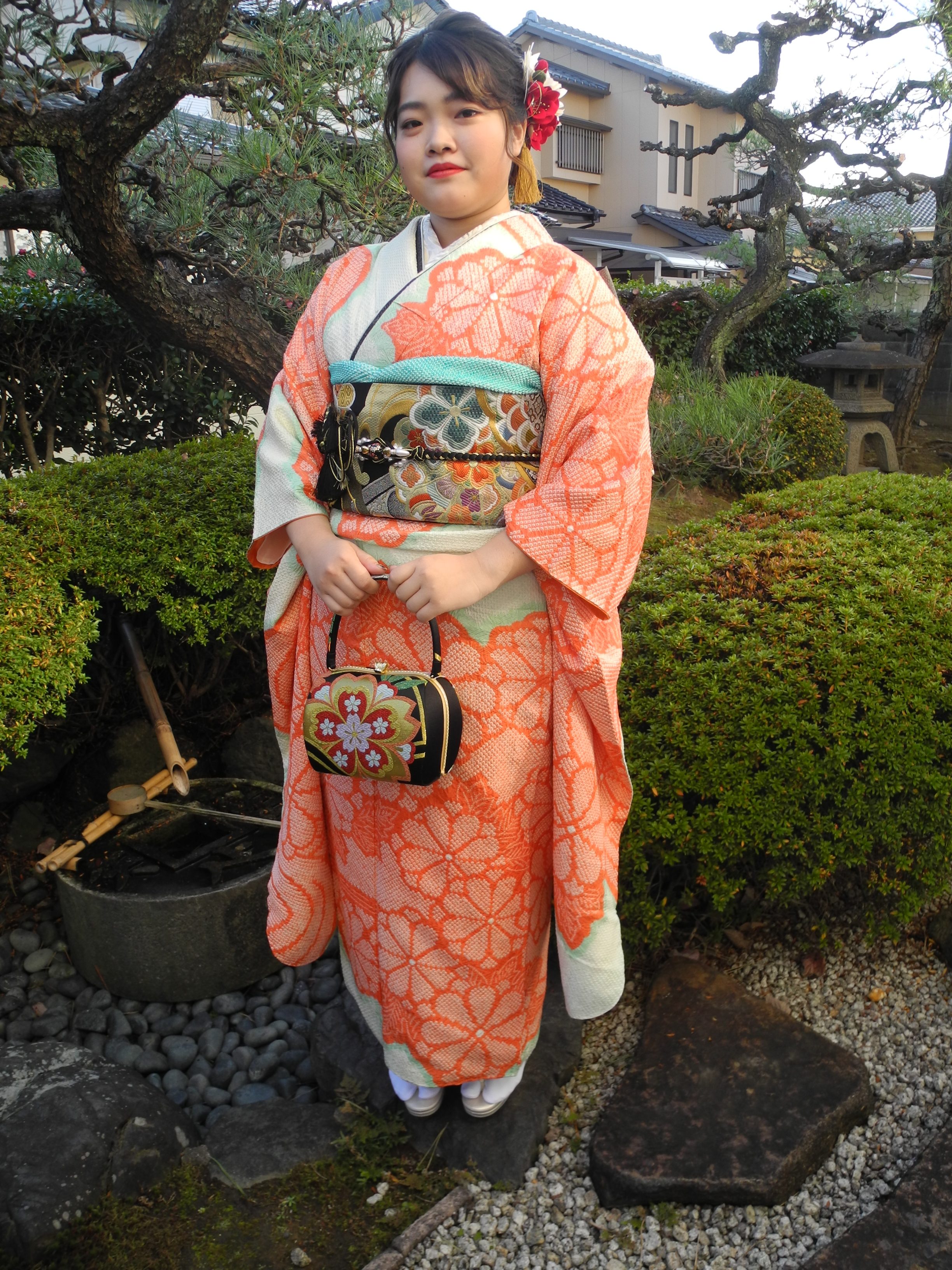 淡い、オレンジと水色のお振袖に、黒の小物類でまとめていただきました。帯は着物と同じ、菊や吉祥文様、自然模様などを複雑に取り入れた古典柄。