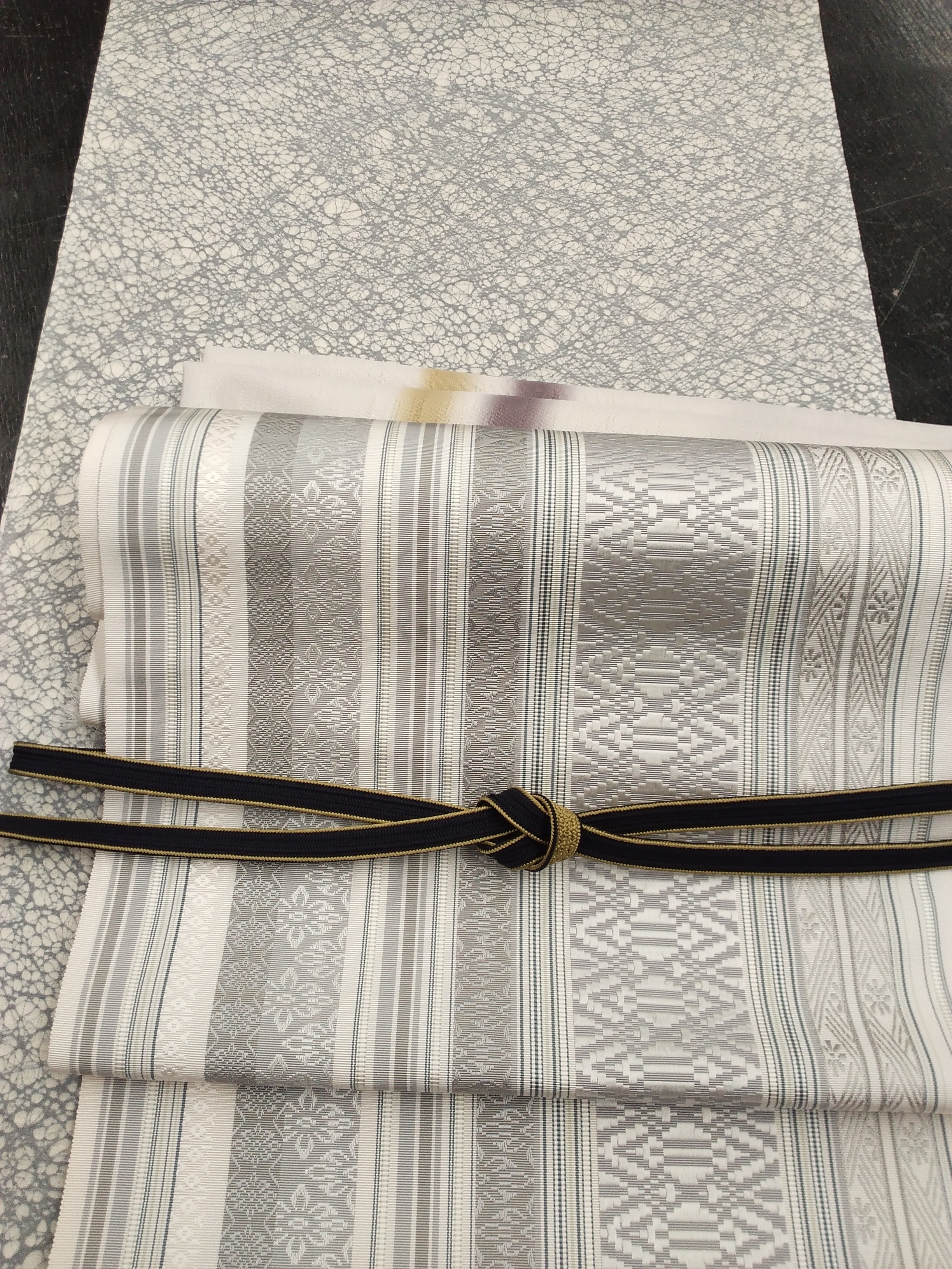 こちらは白地にグレーの大理石のような柄の小紋に同じ、色とグレー系の博多帯を合わせました。