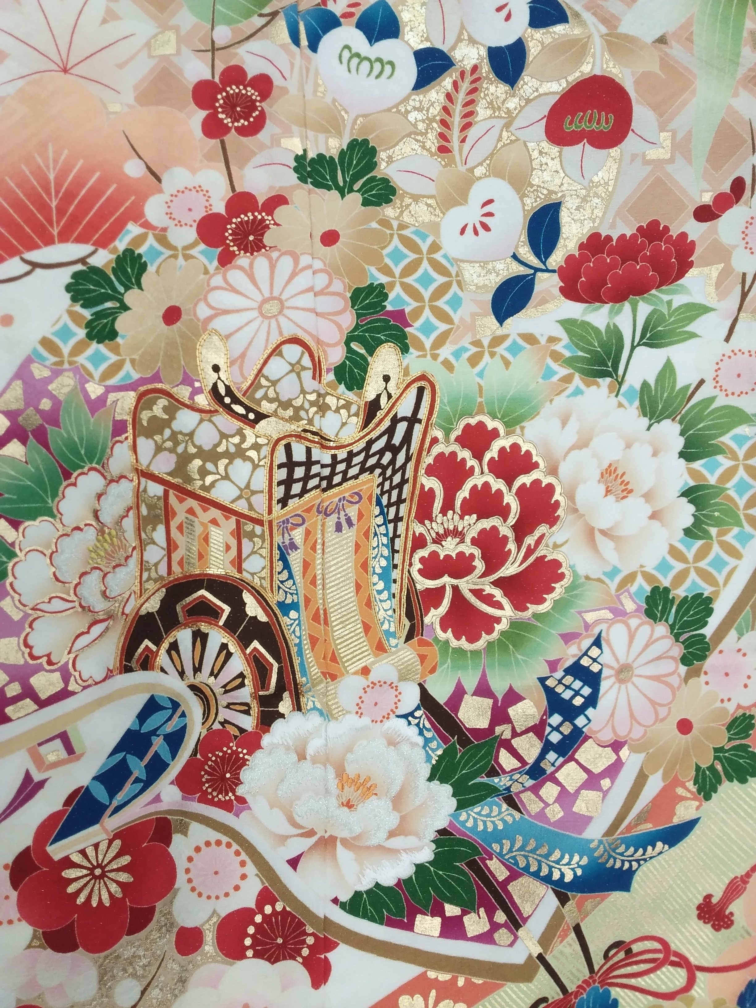 御所車に牡丹、菊、橘、梅、松、高貴な王朝文化の象徴の柄。御所車と牡丹には、金駒刺繍が施され、きらびやかで美しいお振袖です。