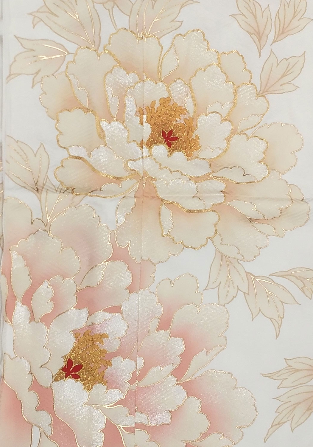 白地の着物に大柄で牡丹が描かれています。金の縁取りが美しい、とにかくゴージャスなお振袖です。