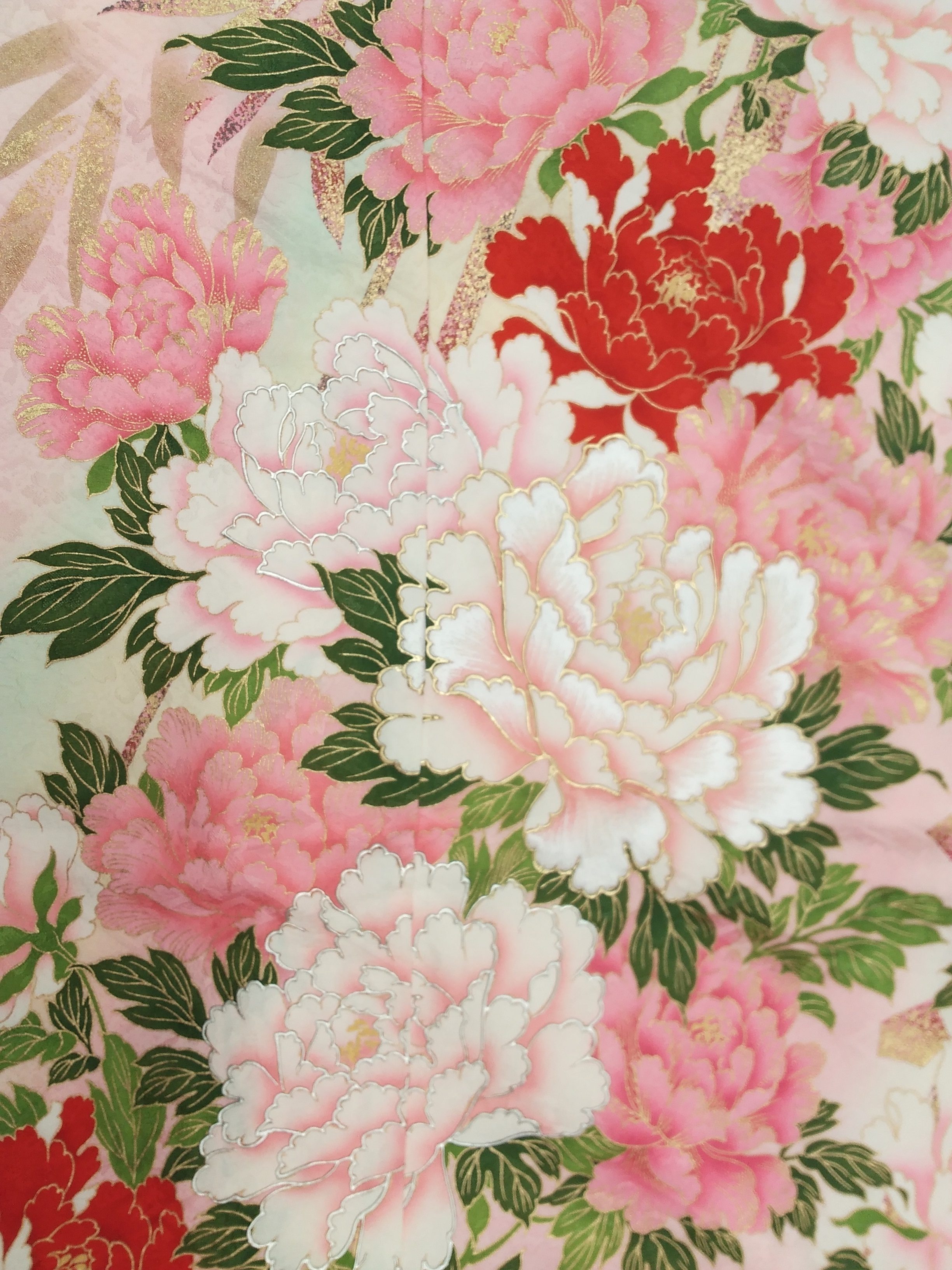 写実的な牡丹と少しだけ竹の影が見える、色合いがと素敵なお振袖。