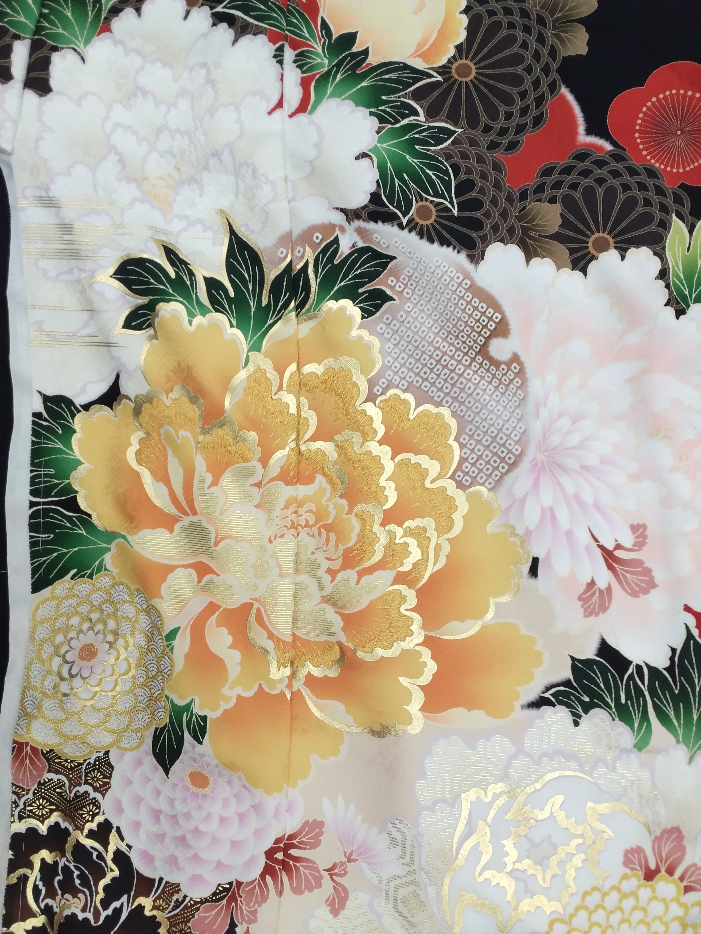 こちらは大きな大きな黄色と白の牡丹柄。お着物全体は黒地で上半身は梅や松で描かれた独創的なお振袖。