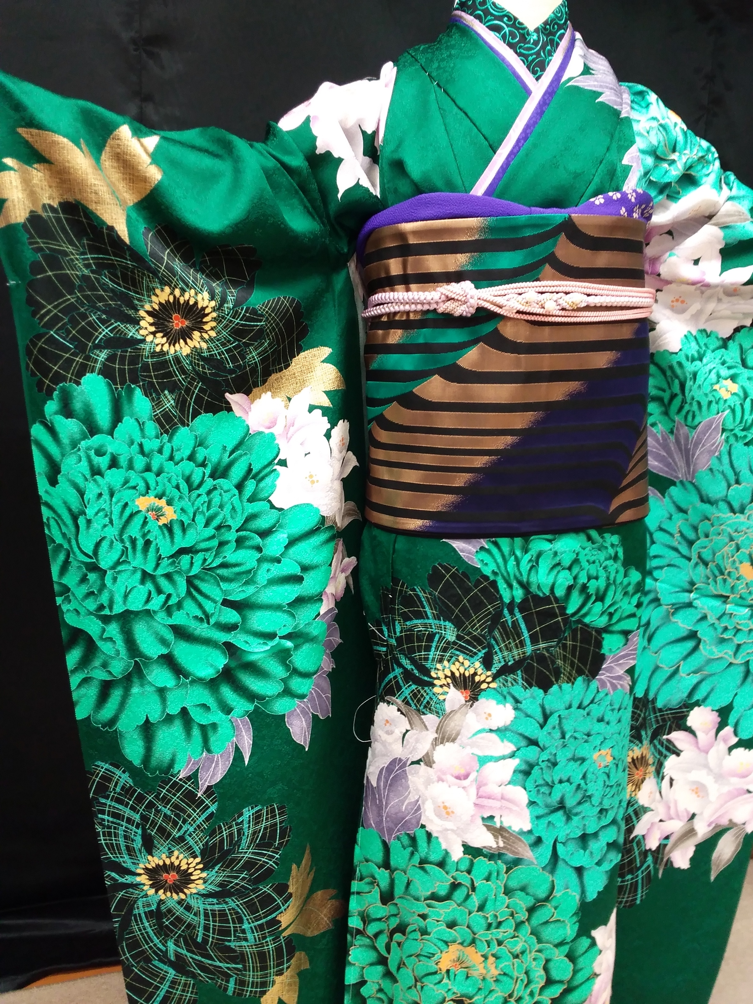 何とも言えない緑色のお振袖にカトレアと大きな牡丹が描かれたお振袖。