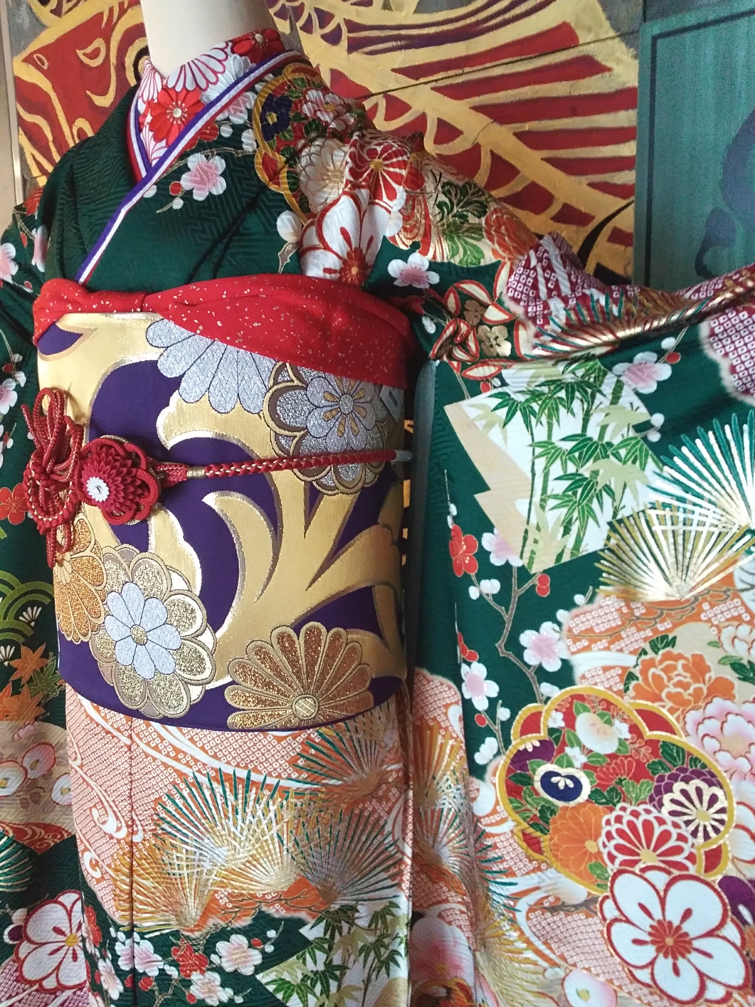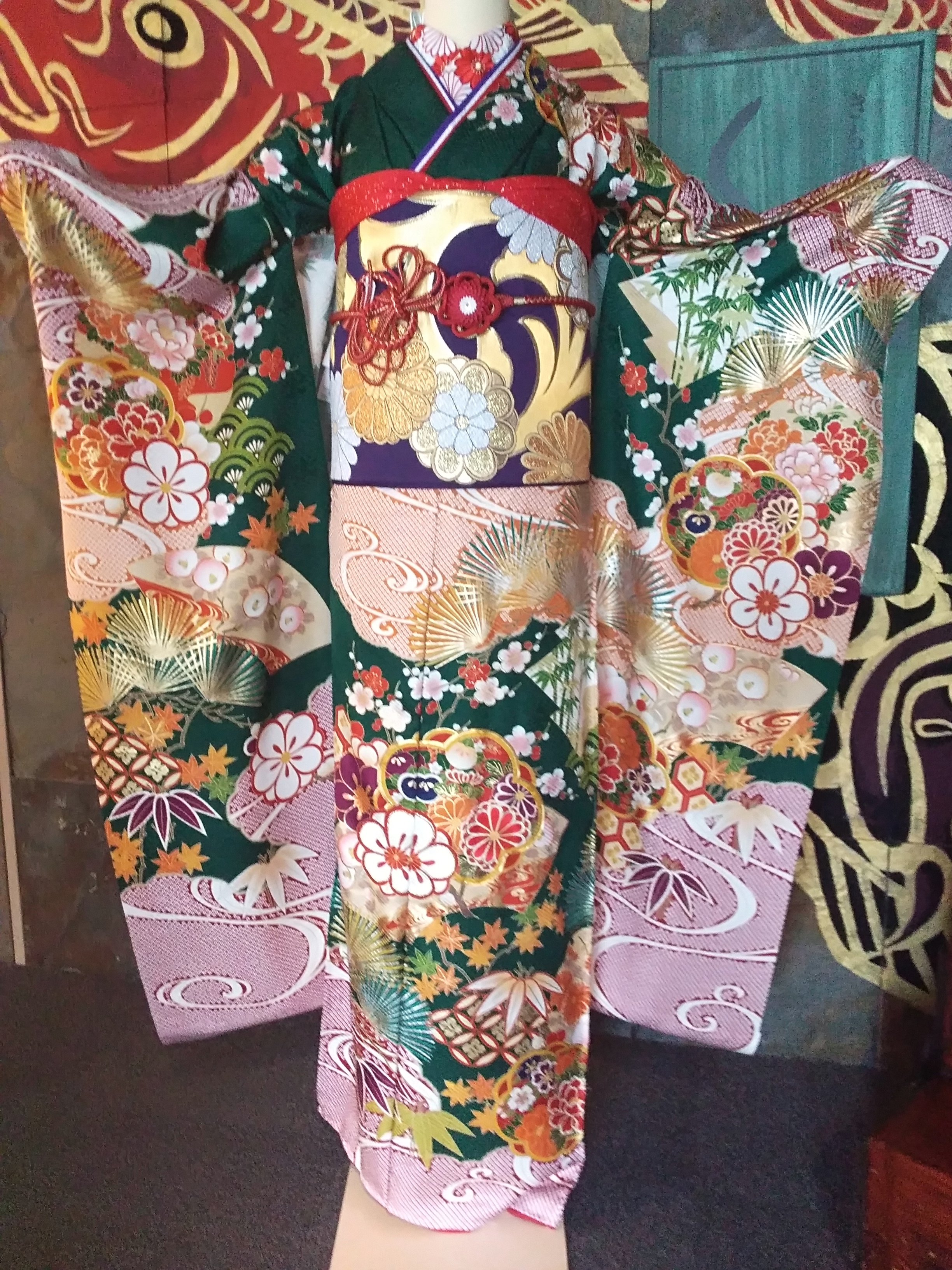 振袖は菊、松竹梅、流水、七宝、紅葉、橘、亀甲、扇、牡丹といった吉祥文様づくし。