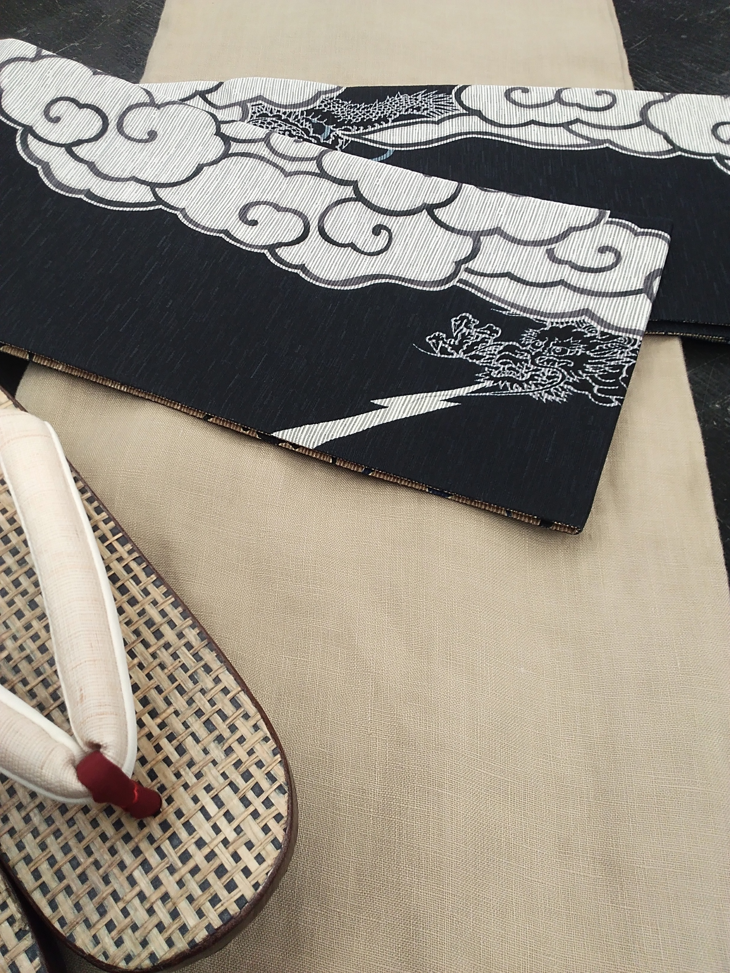 ①雲から龍が覗く半巾帯に下駄を合わせて。カジュアルに。