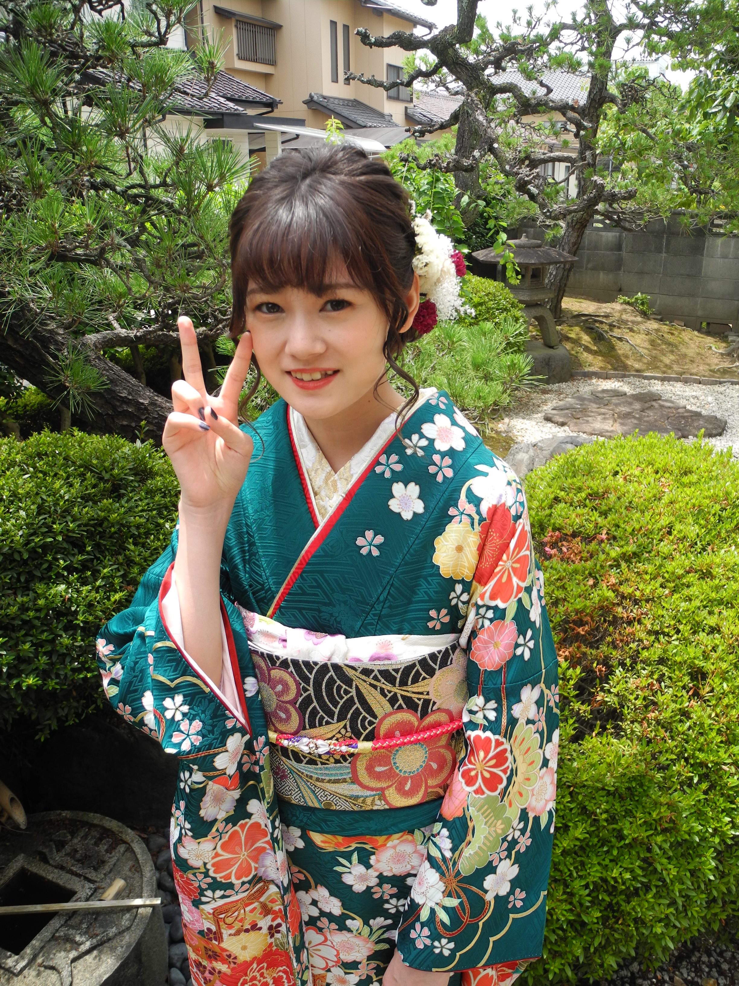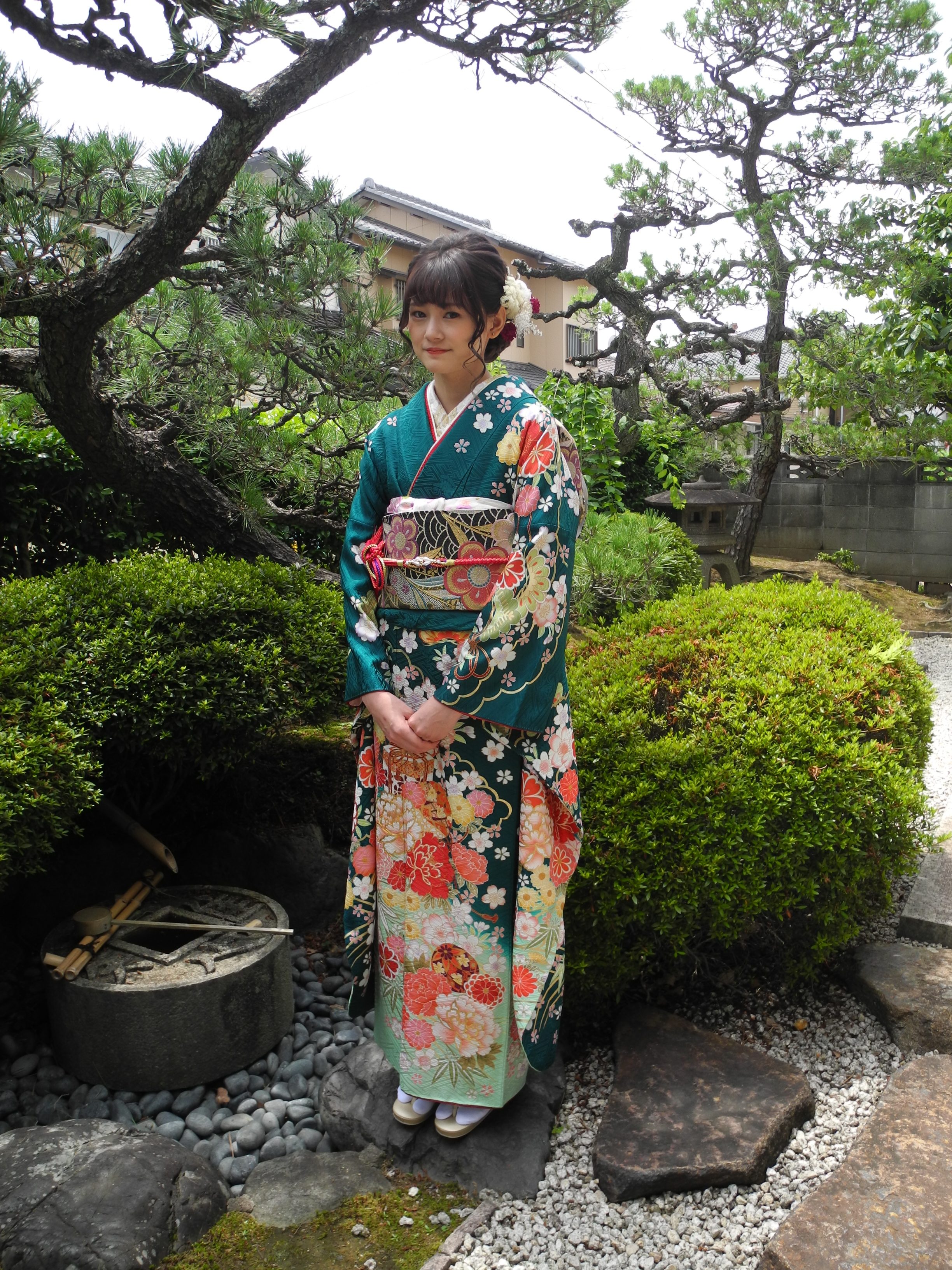 最近は、緑や、青のお振袖をご要望のお嬢様が増えており、お嬢さまのお振袖も、美しい女性を表す牡丹、高貴な女性の遊び道具の毬や貝桶の柄に、桜、菊、松などのおめでたい花柄のお振袖。