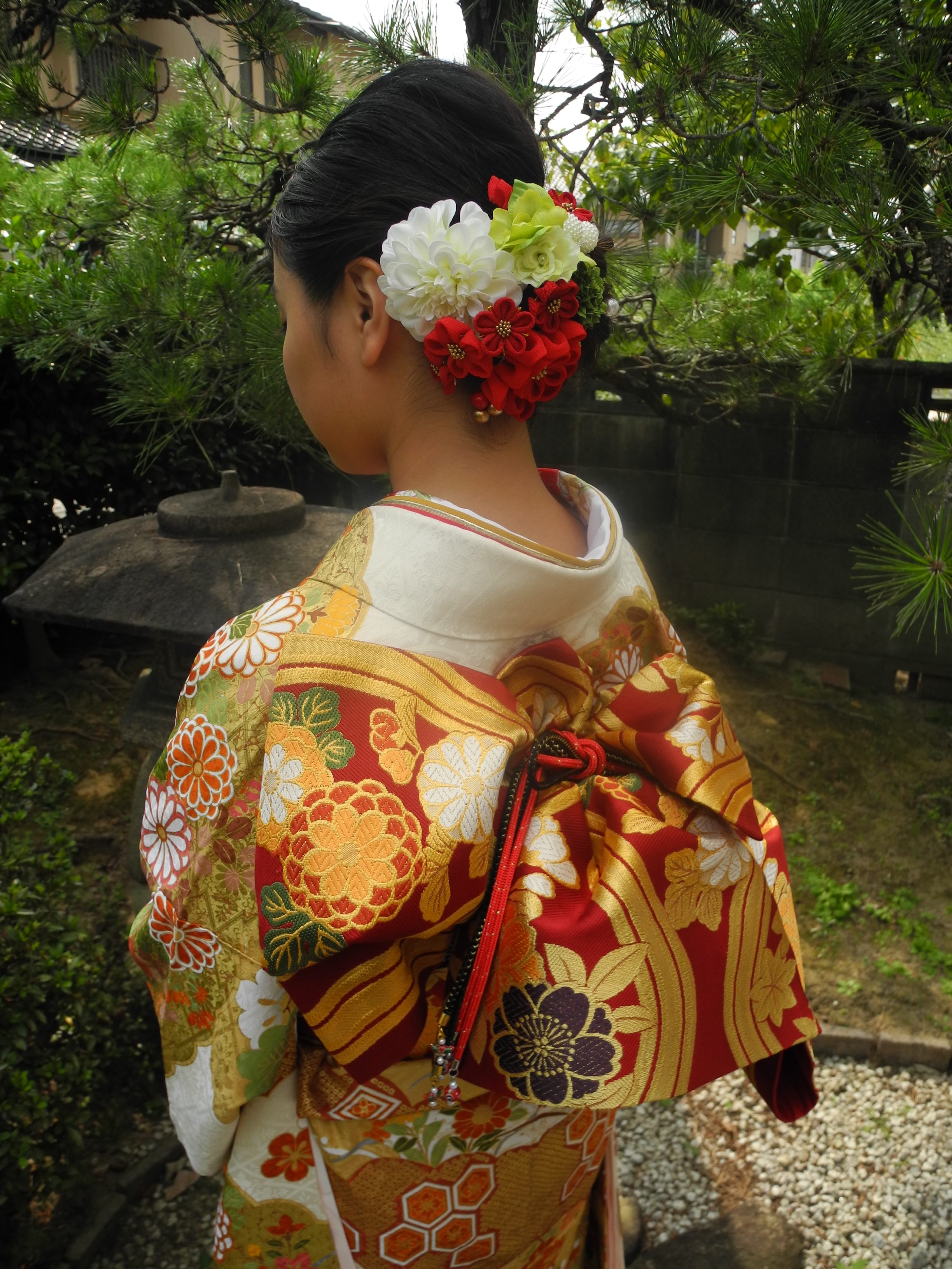 髪飾りはお着物の色に合わせて、赤、白、緑とたっぷりとつけていただき、お着物に負けないゴージャスな合わせですね!