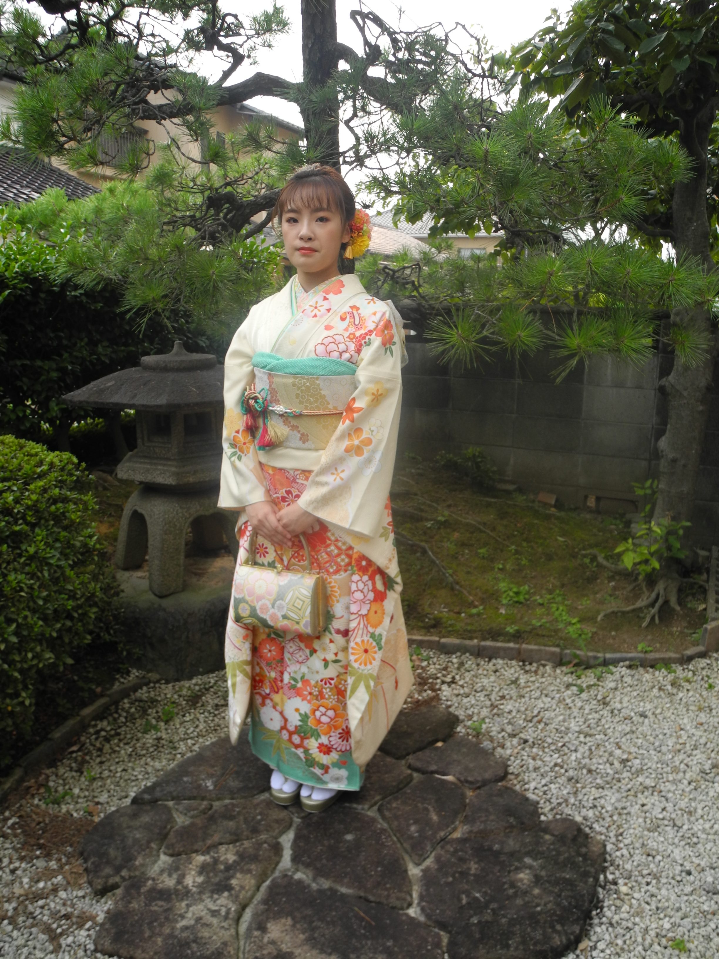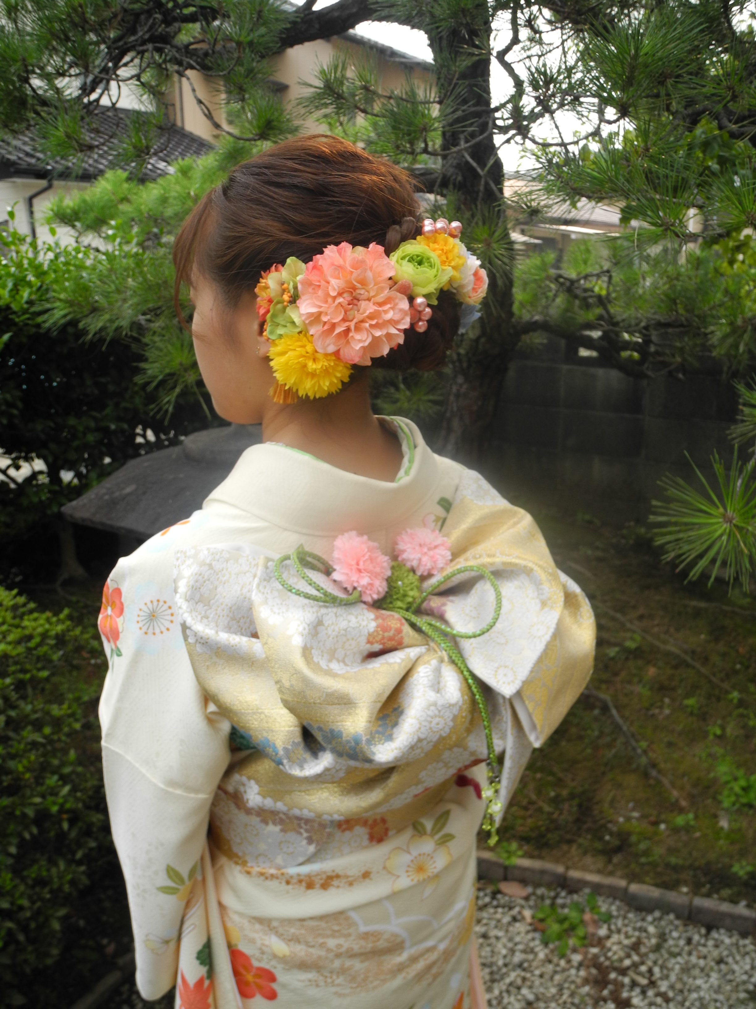 髪飾りは、着物の花柄からやさしい色合いの花を沢山つけて頂き、ボリュームたっぷりで、後ろ姿もとても華やかですね。