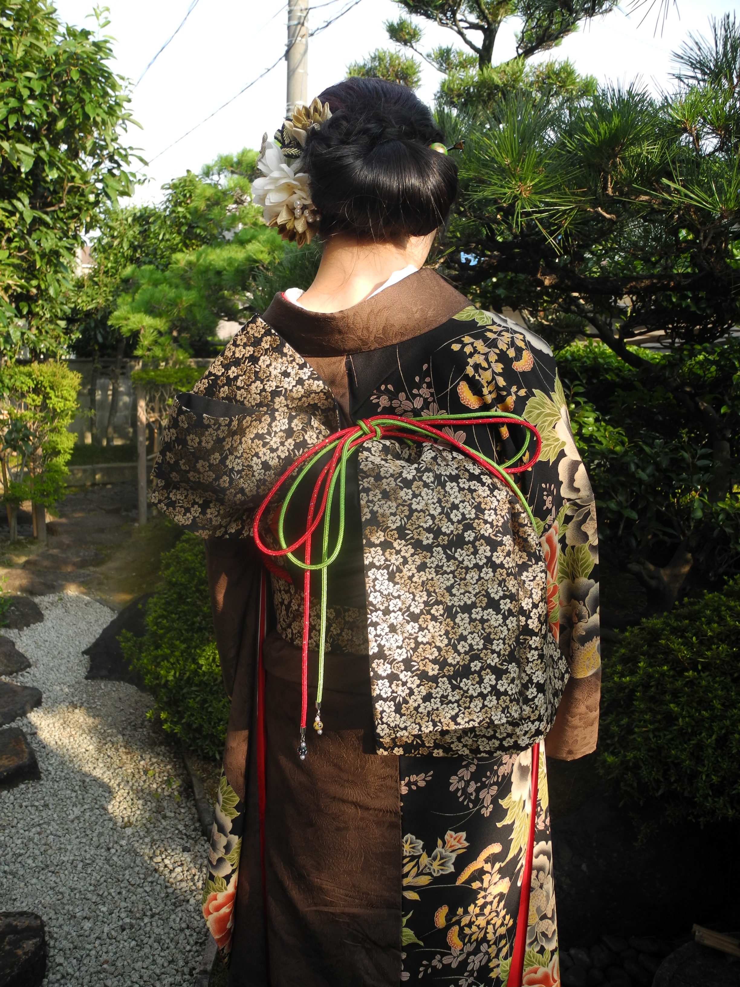 帯も草履バッグも金を出来るだけ使わず、シックに合わせて、小物は赤で統一し、可愛らしさもあります。