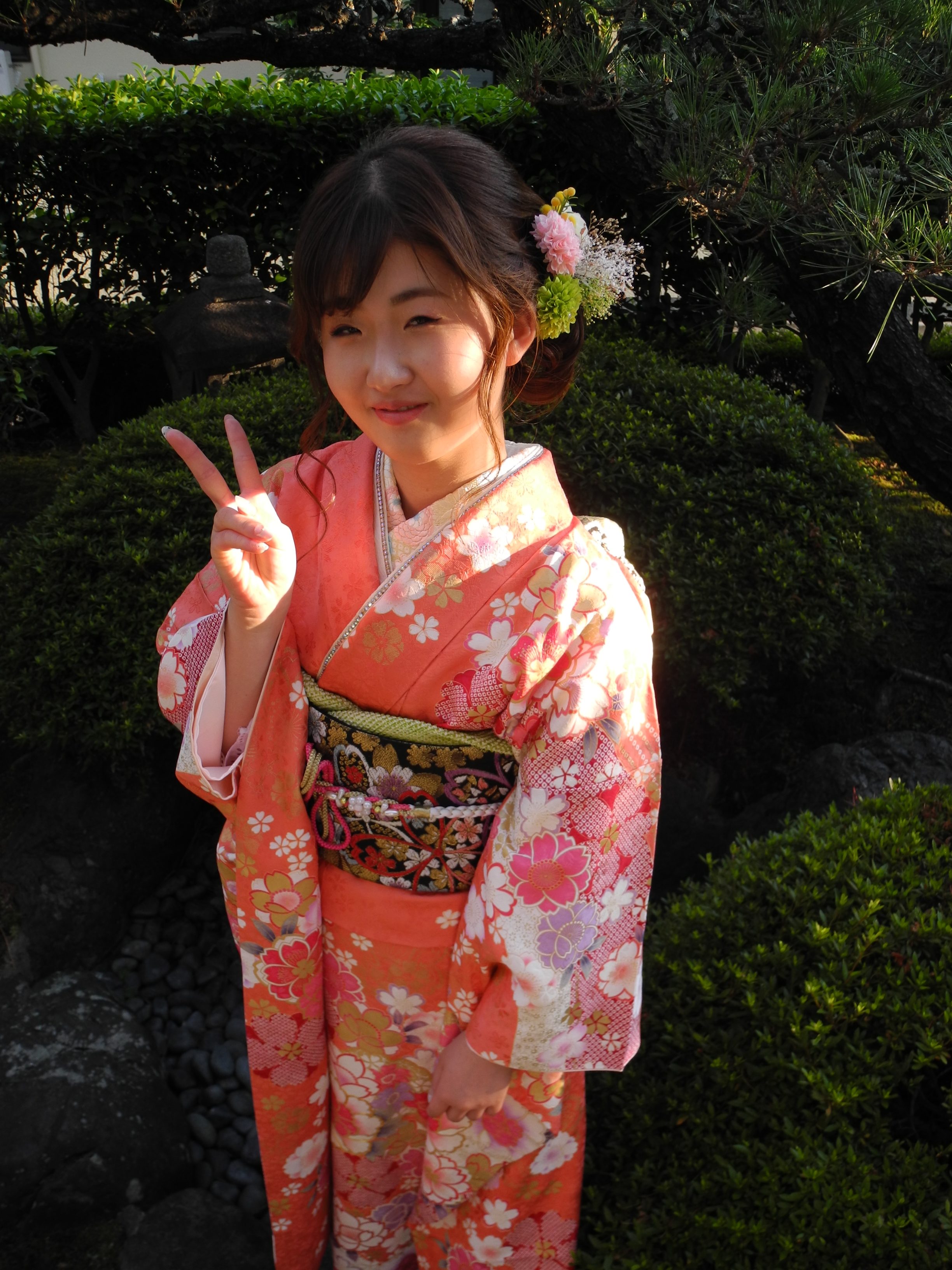 小柄なお嬢さまはサーモンピンクのお着物に、白と抹茶で小物をまとめて可愛らしい着こなしです。