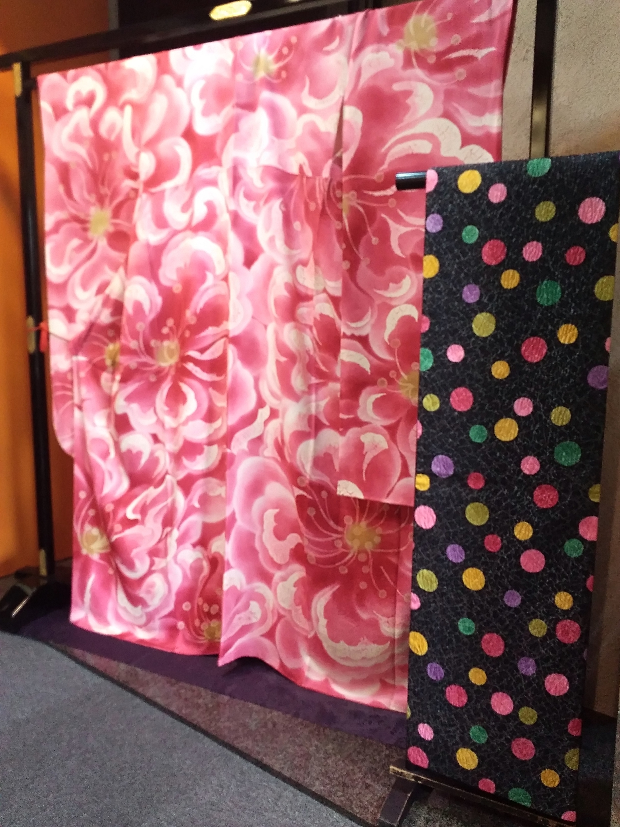中野先生のお振袖は、お嬢さまの顔、雰囲気を見てから描くのです。そして、このように飾られているときよりも、羽織った時の着姿が素敵に見えるように計算された絵を描いています。