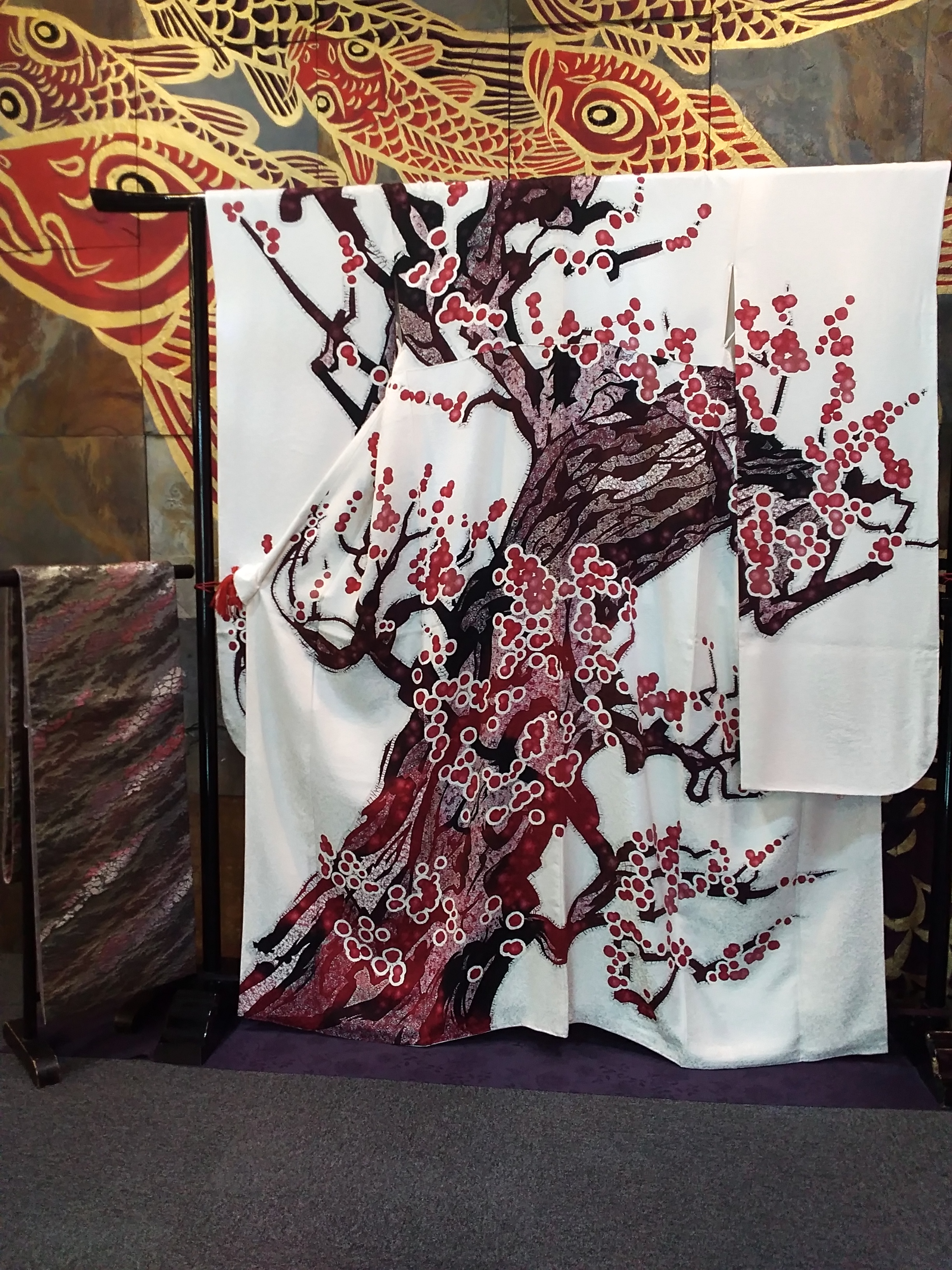 こちらの振袖は大木の梅。帯も合わせて作られています。帯は木の幹のような織りと色も紅白を混ぜた色合いがとても素敵です。