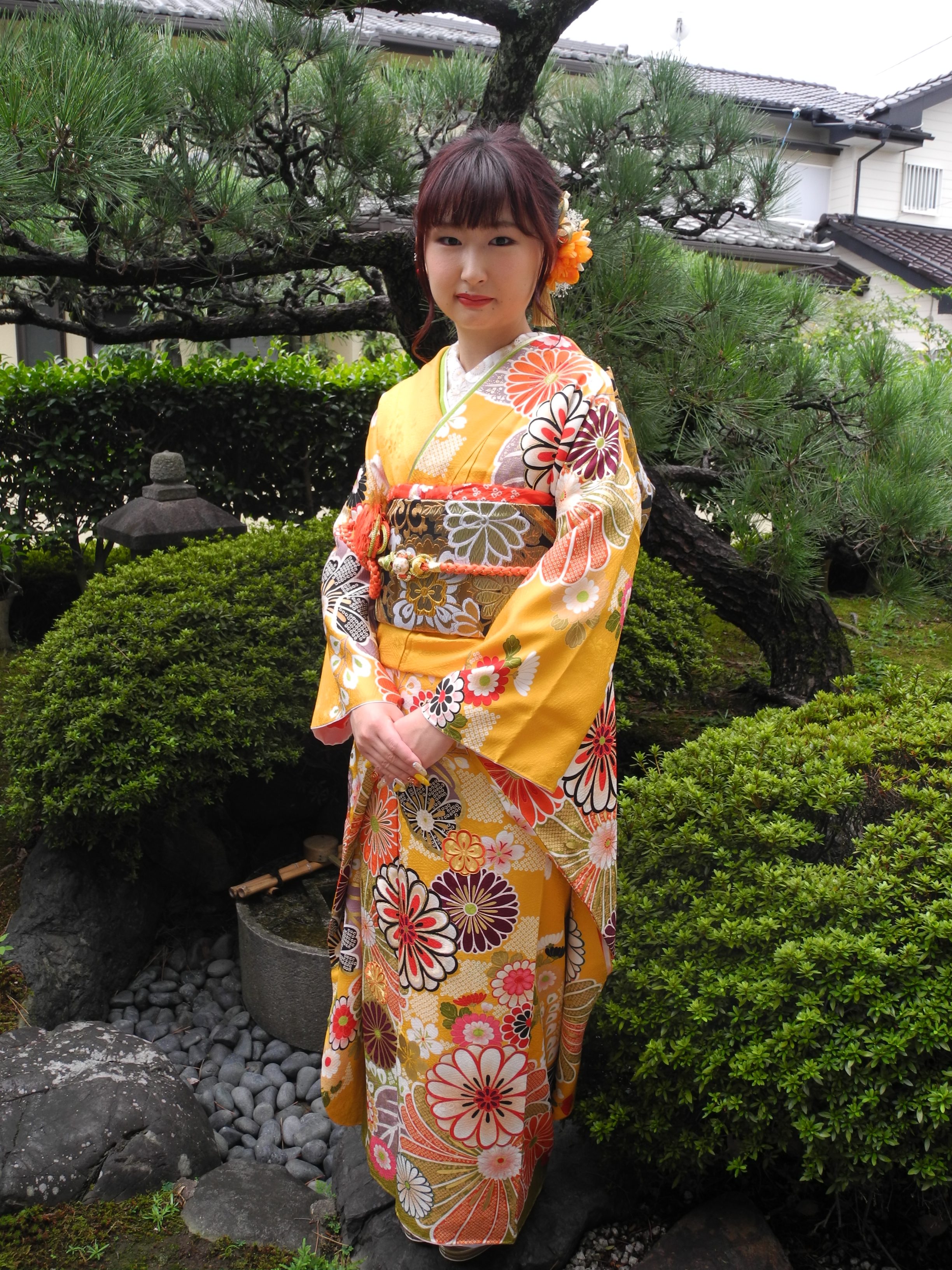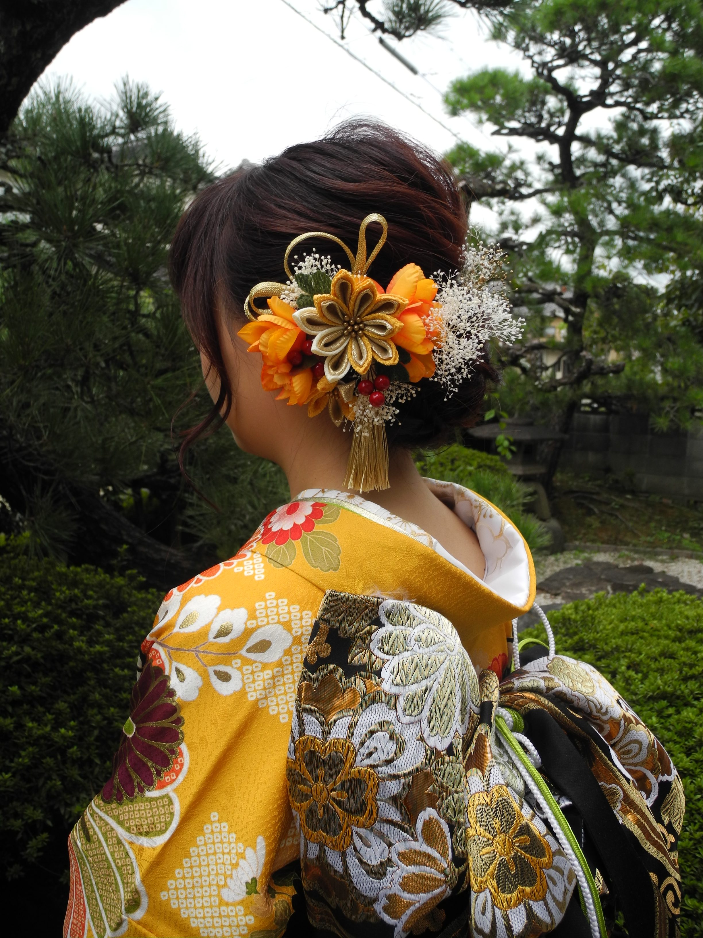 この振袖を気に入って頂き、全体を黄色、オレンジ、きみどりでまとめて、ビタミンカラーコーデになりました。