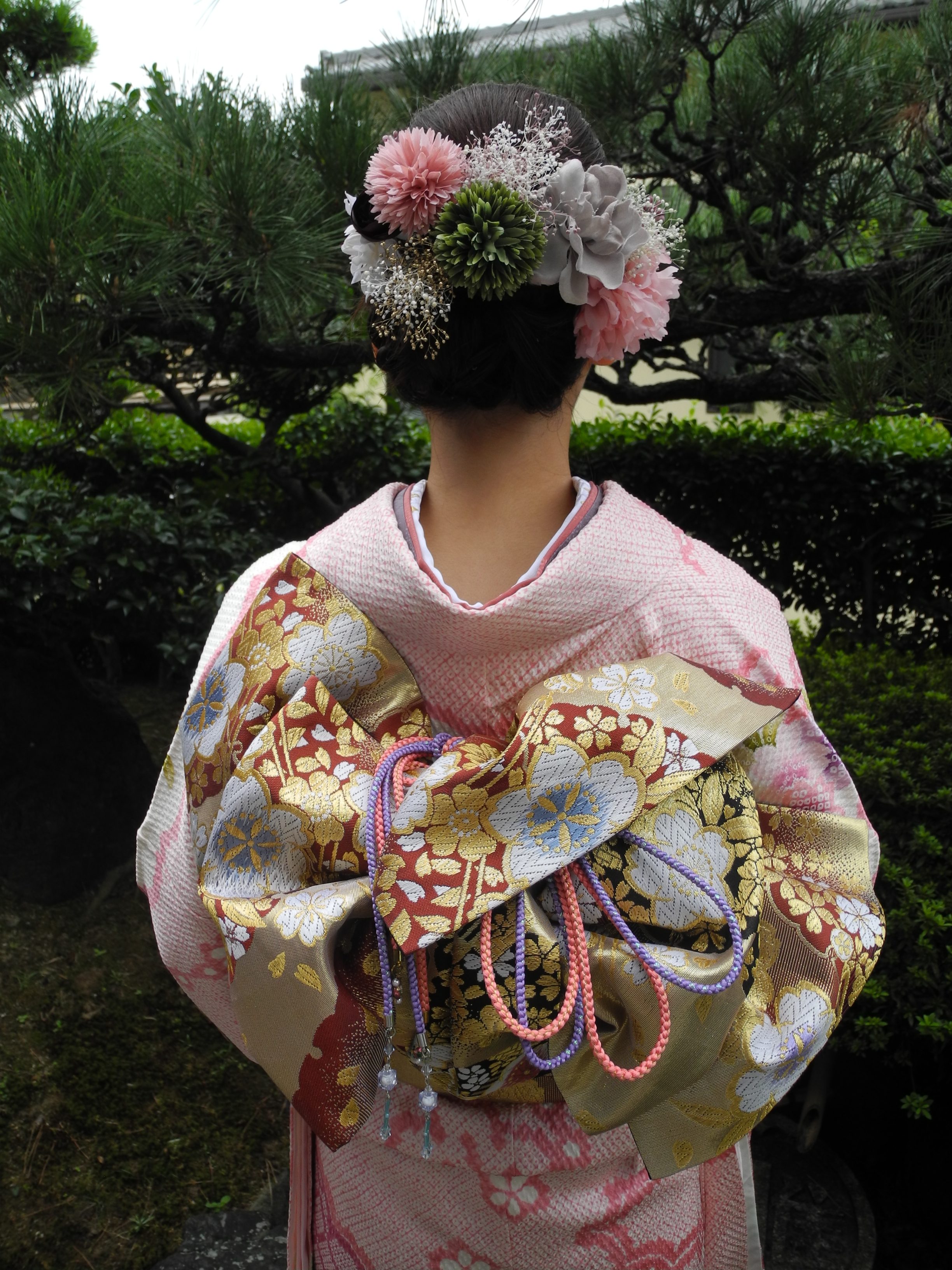 お姉様の可愛らしい色合いのお振袖の中から、色合わせをして小物をコーディネイトしていただきました。