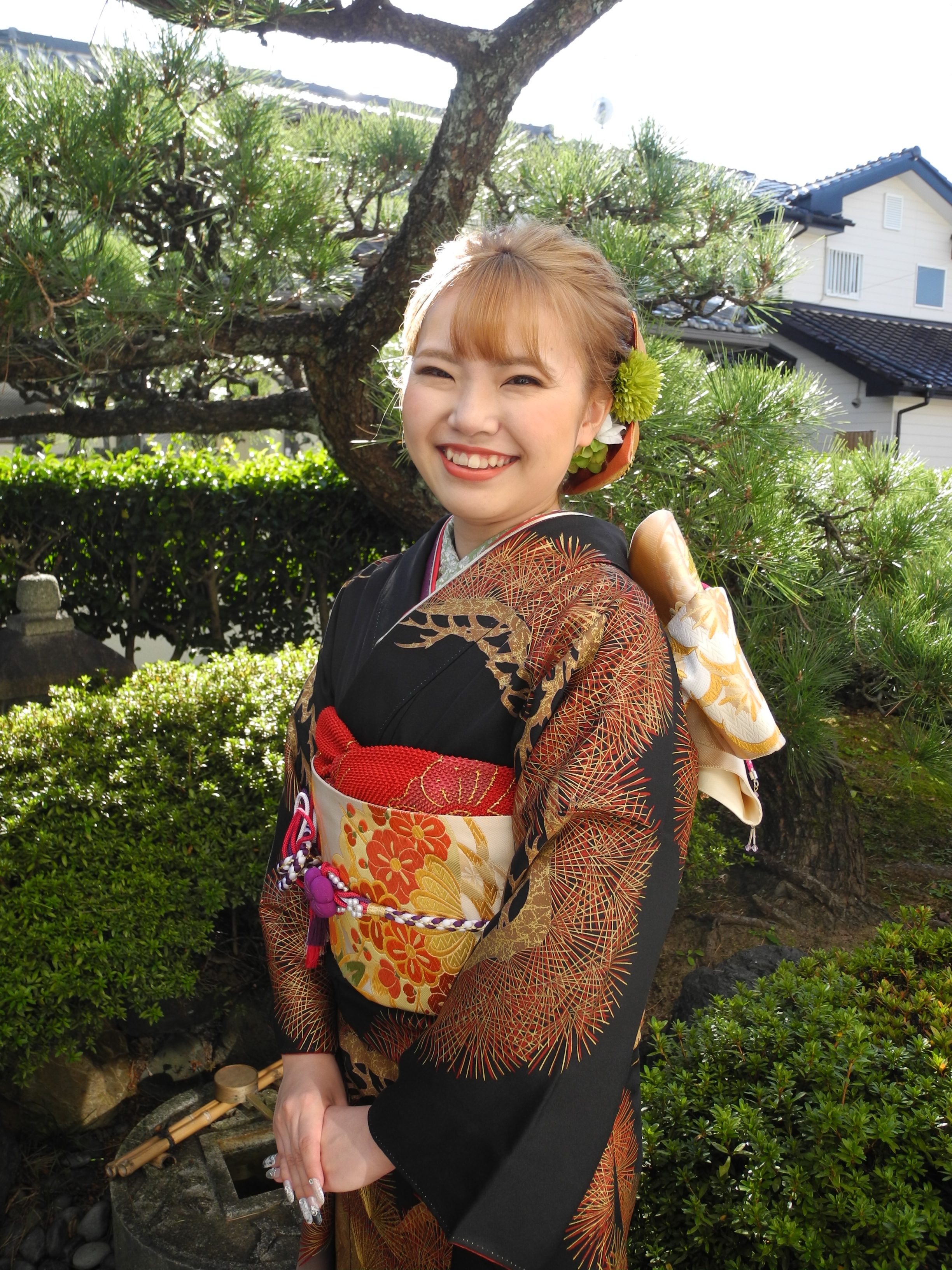 お母様の黒地に松が描かれたカッコイイお振袖に、松竹梅の白地の帯や小物を合わせて頂き、明るく華やかなコーディネイトは笑顔の素敵なお嬢さまにお似合いです♡