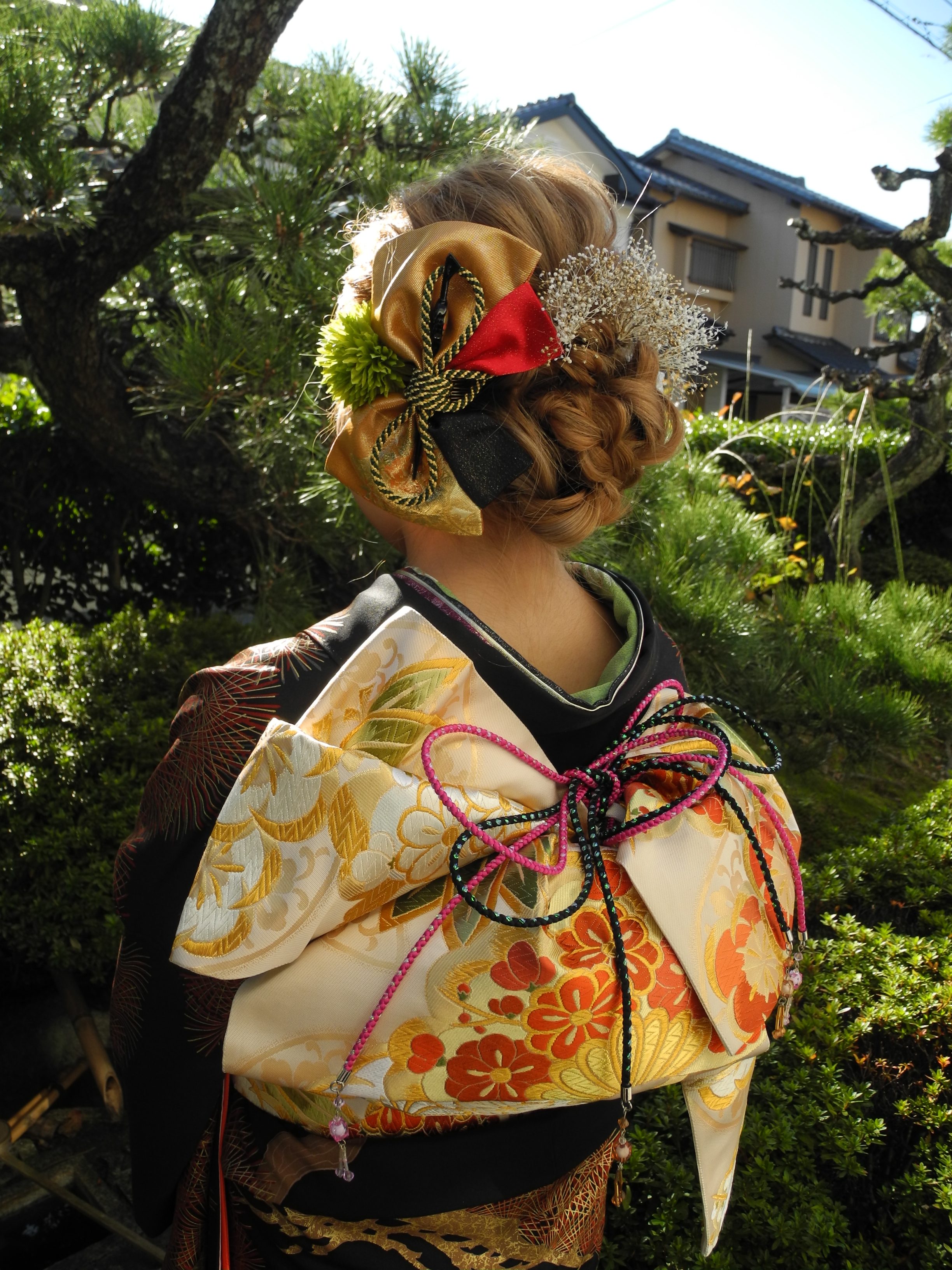 髪飾りにはお振袖に合う大きなリボンと流行りのカスミソウと抹茶色の花を合わせて、お嬢さまの髪色にとても合っていますね!