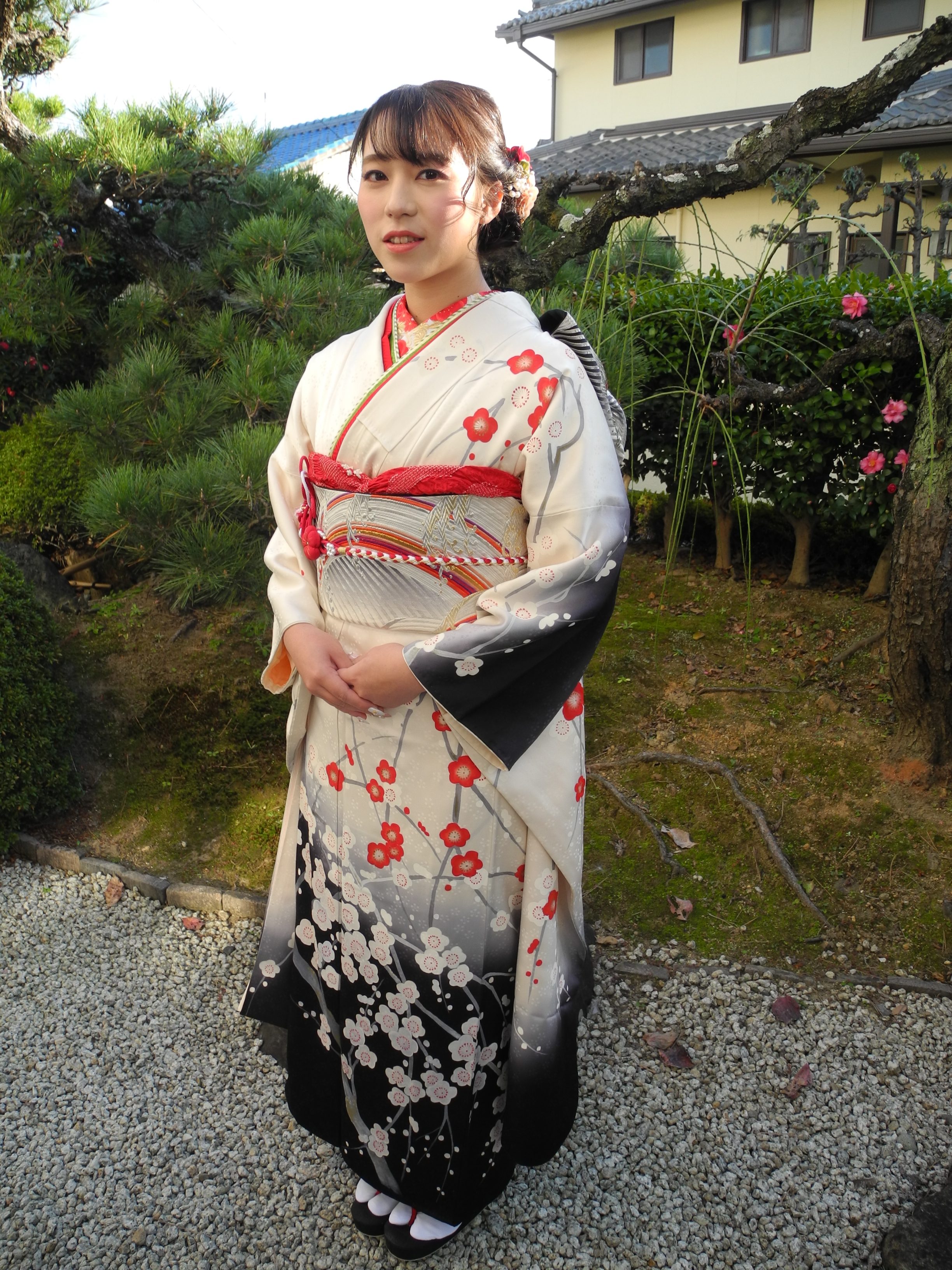 白地に紅白の梅が令和の成人式にふさわしい模様ですよね。この梅は手書きで描かれたもの。